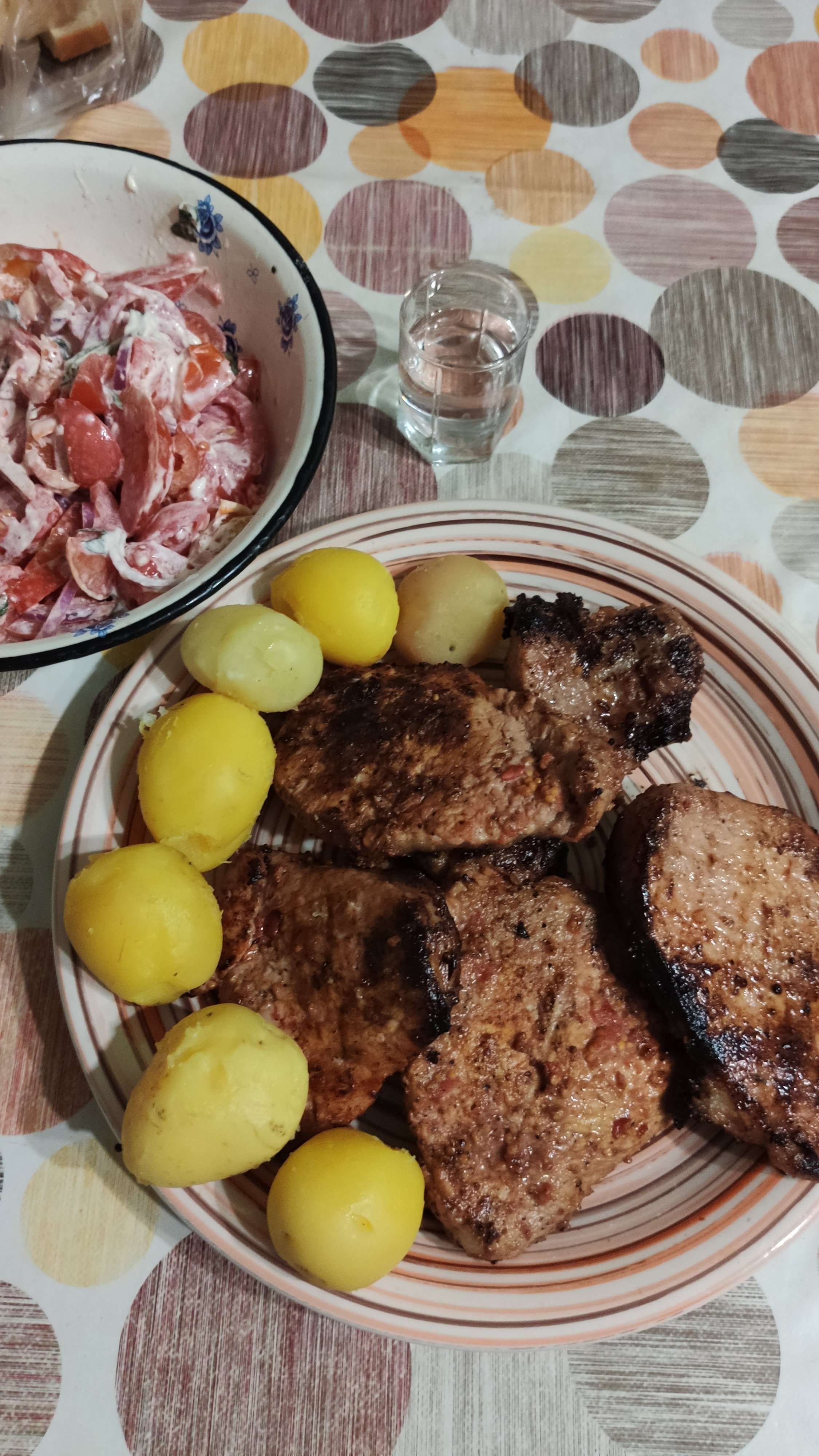 А как же селёдочка к такой картошечке,...ммм, и случком, это первое что наум пришло, ну а бифштекс конечно зачетный, но к нему бы соусы хорошие и салат, ну там вроде есть из помидор.