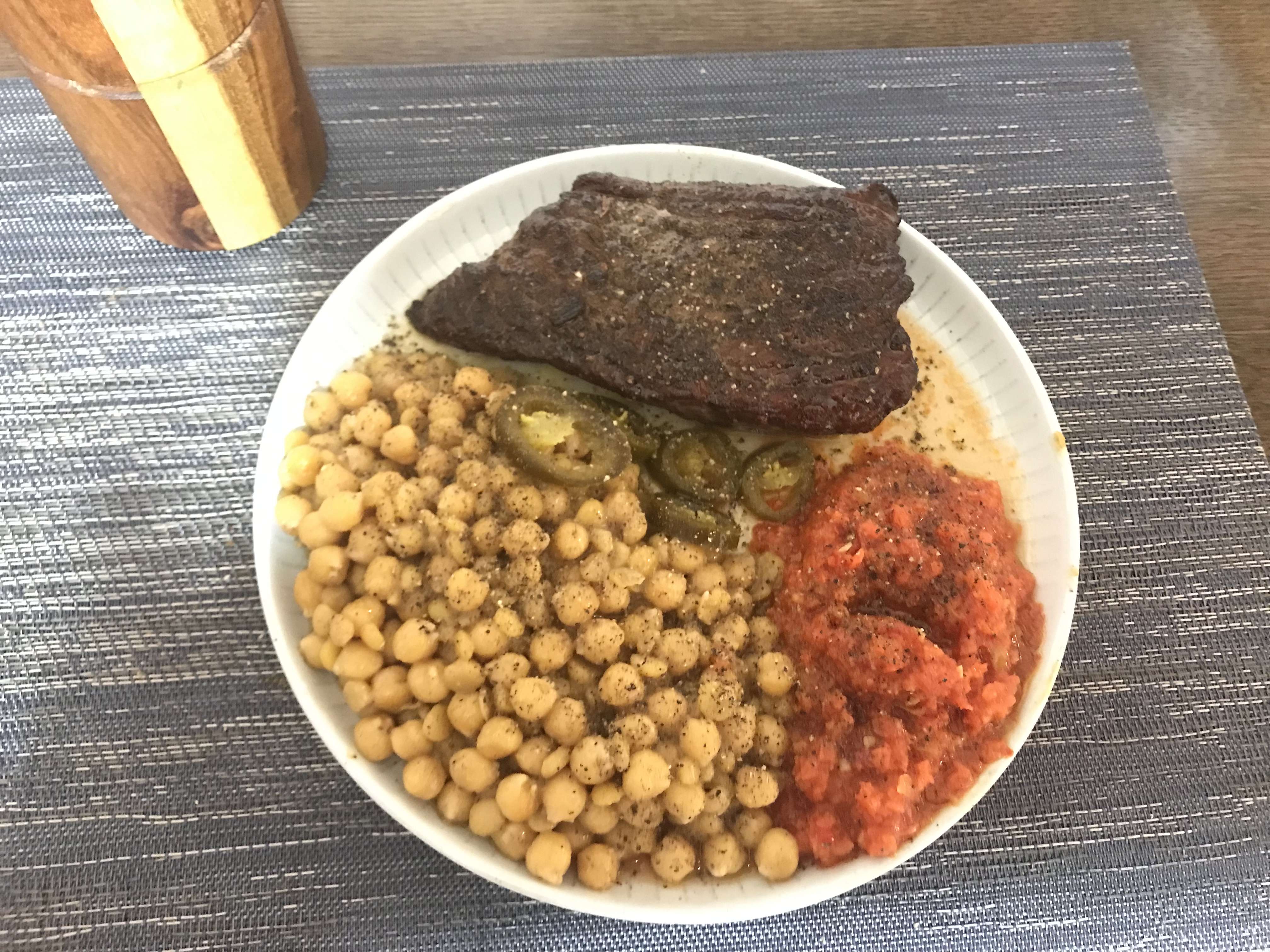 Нут, горох, аджика и говядина. Аджика не острая так что добавил перца. а на неделю контейнер гречки и куриные грудки.