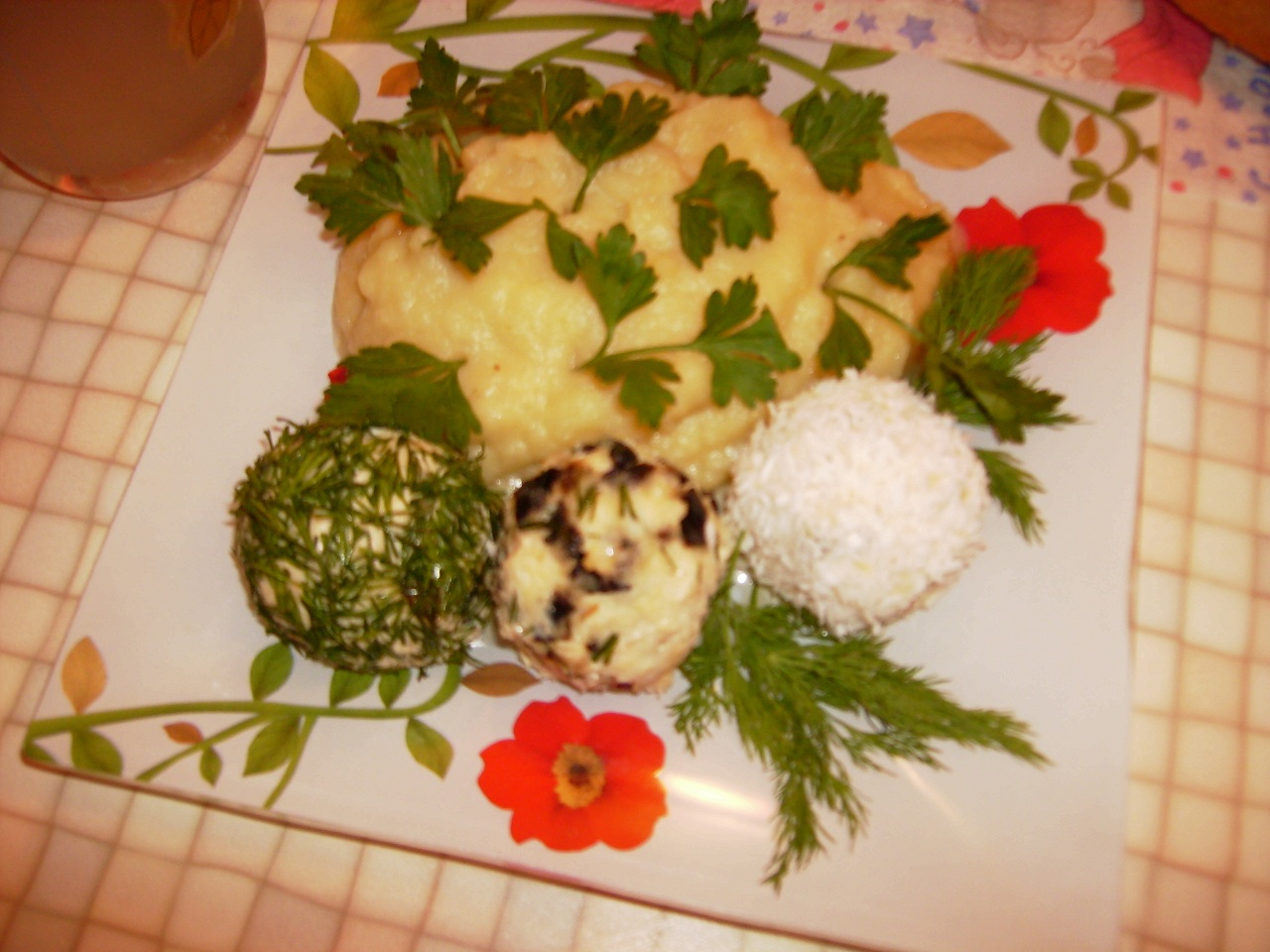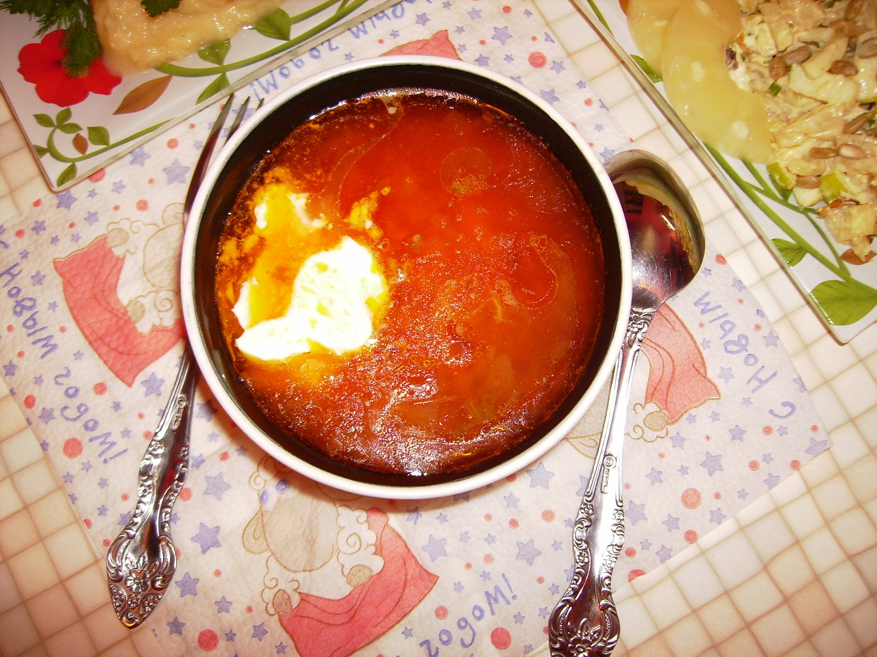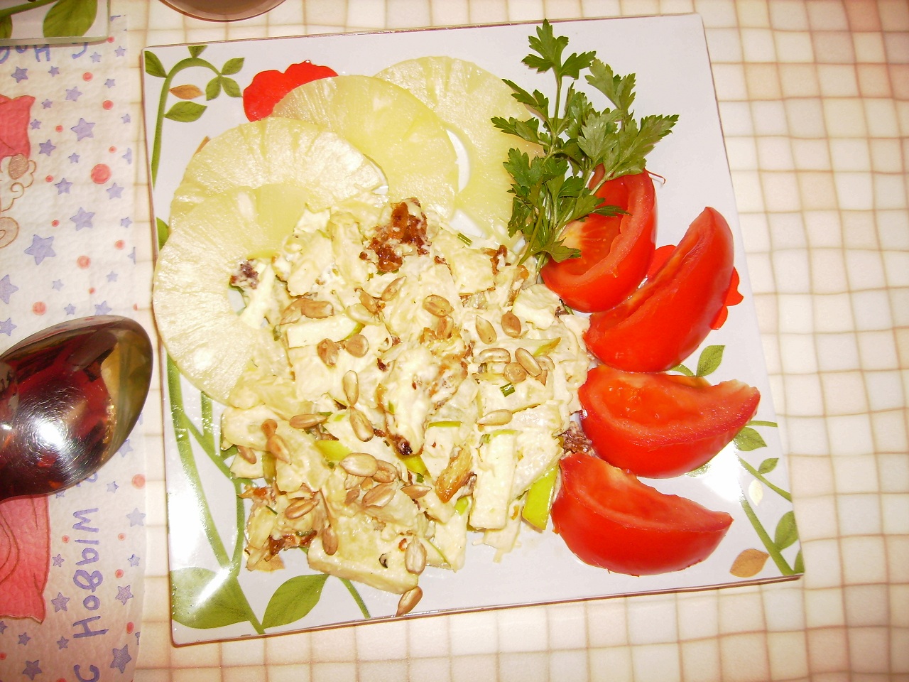 а у меня прямо сытный воскресный ужин был вчера: на первое борсчь со смятанкой на второе пюре картофельно-цветнокапустное (типо полезно) с куриными рафаэлками: а)куриное мяско с черносливом внутри в кокосовой стружке б)куриное мяско с чесноком, сыром и грибами в)куриное мяско с черносливом и зеленью на третье салат "буржуй" (рябчики с ананасами) Мелко порезаное и сильно зажаренное мяско курицы, яблоки, ананасы, украшение семечками на четвёртое - компот Облопался от пуза