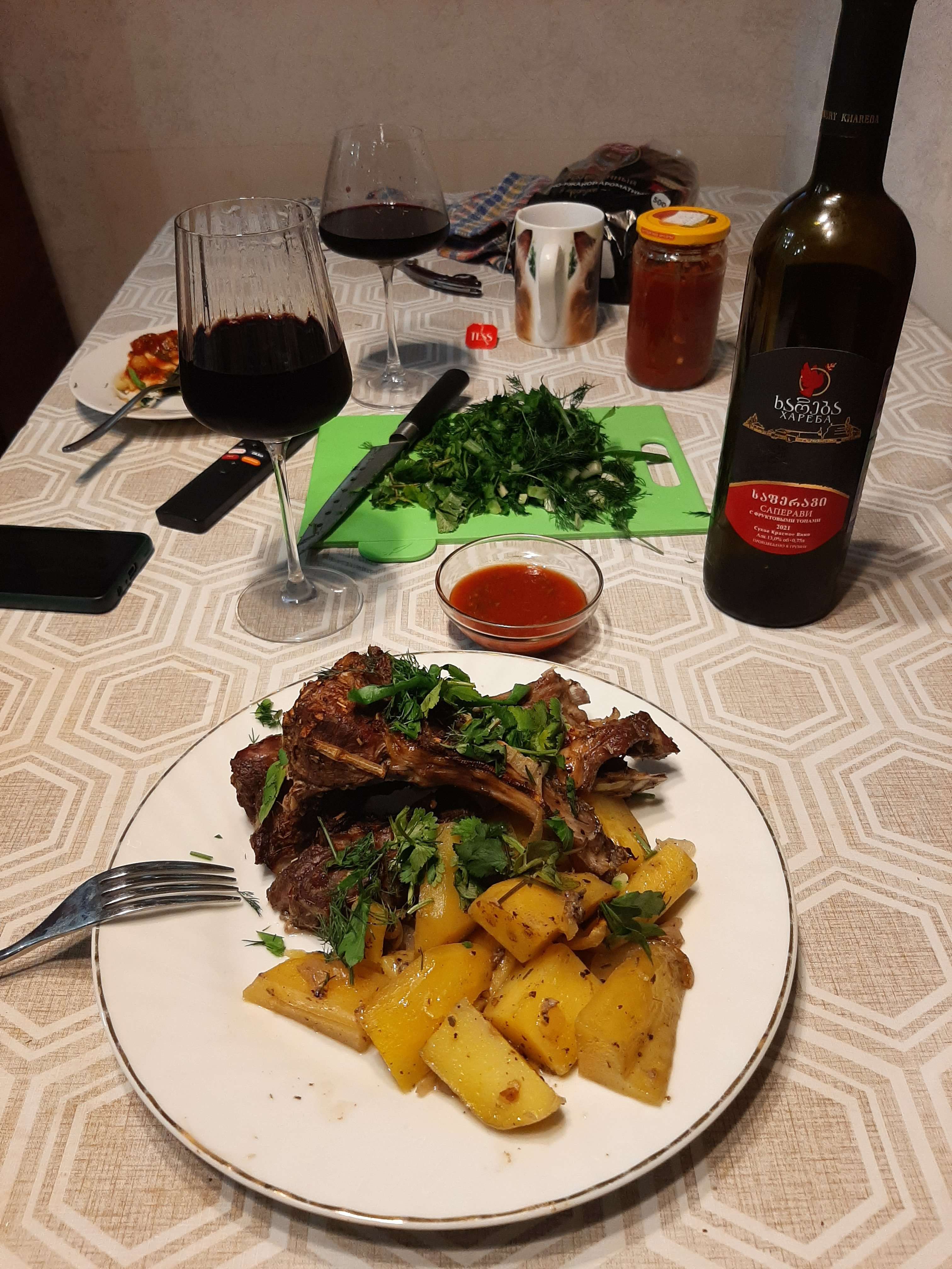 Шампанское «Дербентское игристое» полусладкое белое и ананасы (увы, консервированные). Но и так неплохо вышло.