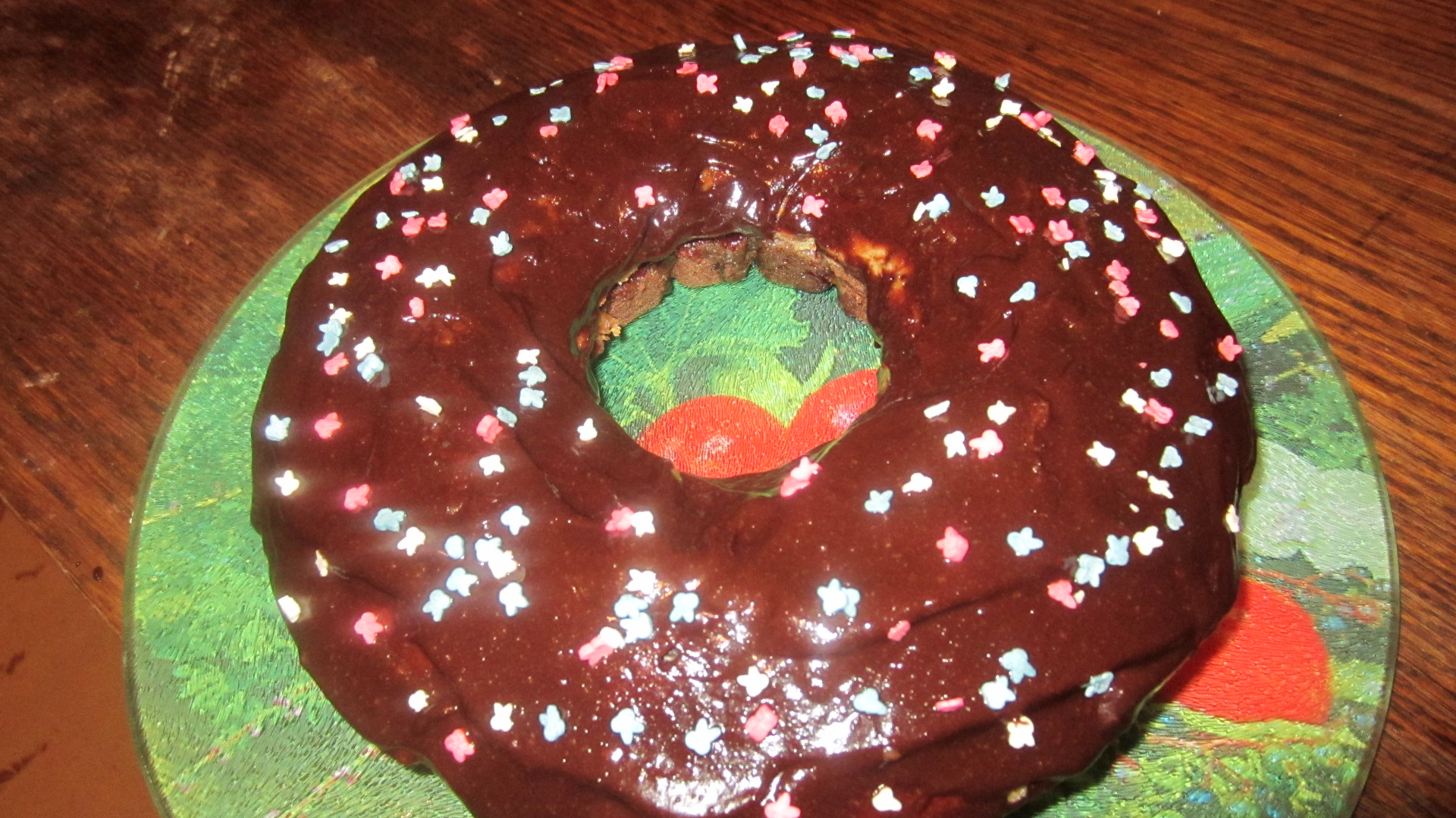 Курицу вчерашнюю доедали с печеной в фольге картошкой На сладкое кекс забацала . называется обнаружила в закромах форму и очень удивилась что она у меня есть Внутри джем клубничный, сверху пропитан коньяком и шоколадной глазурью