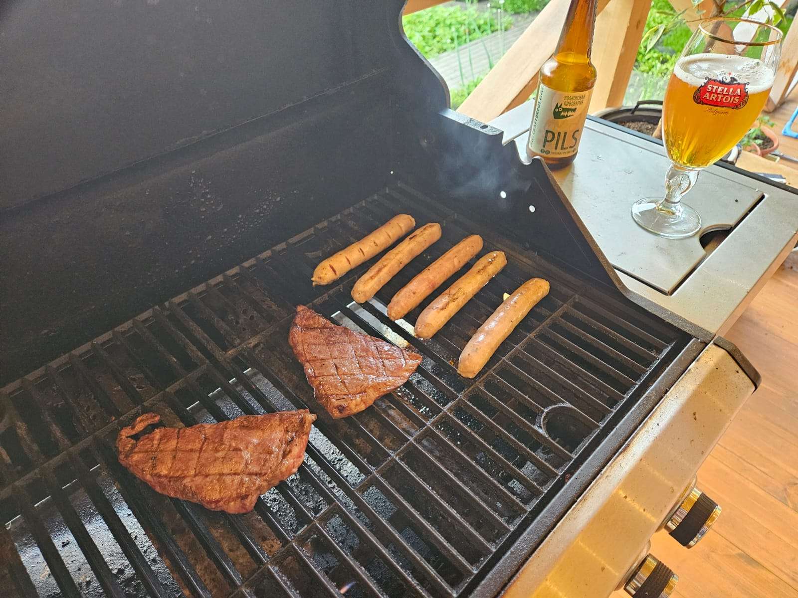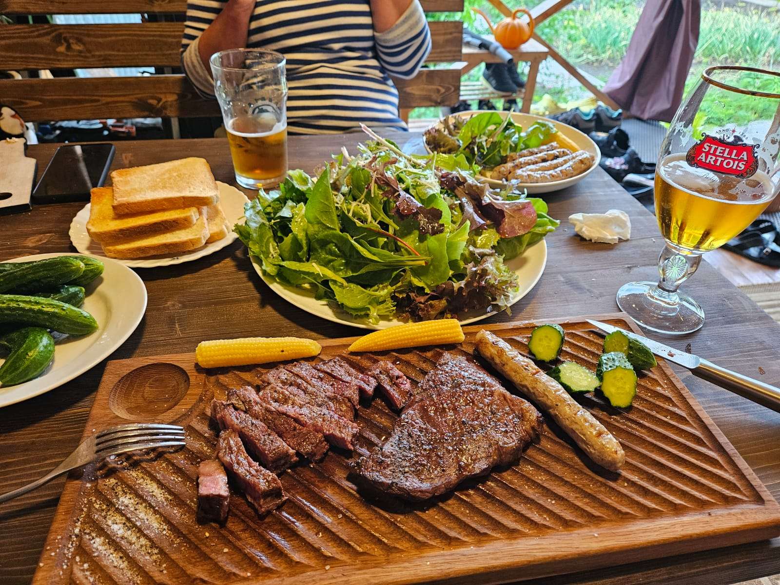 Бычок, купаты из индейки и салатный микс с огорода под пармезаном и трюфельным маслом. Плюсом очень даже неплохой пилснер от волковки.