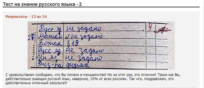 http://www.rb.ru/test/33/ Не стесняемся выкладываем честные результаты 10 из 14 С удовольствием сообщаем, что Вы попали в меньшинство! Но на этот раз, это отлично! Таких как Вы, действительно знающих русский язык, наверное, 10% от всех россиян. Так что, поздравляем, это действительно отличный результат!
