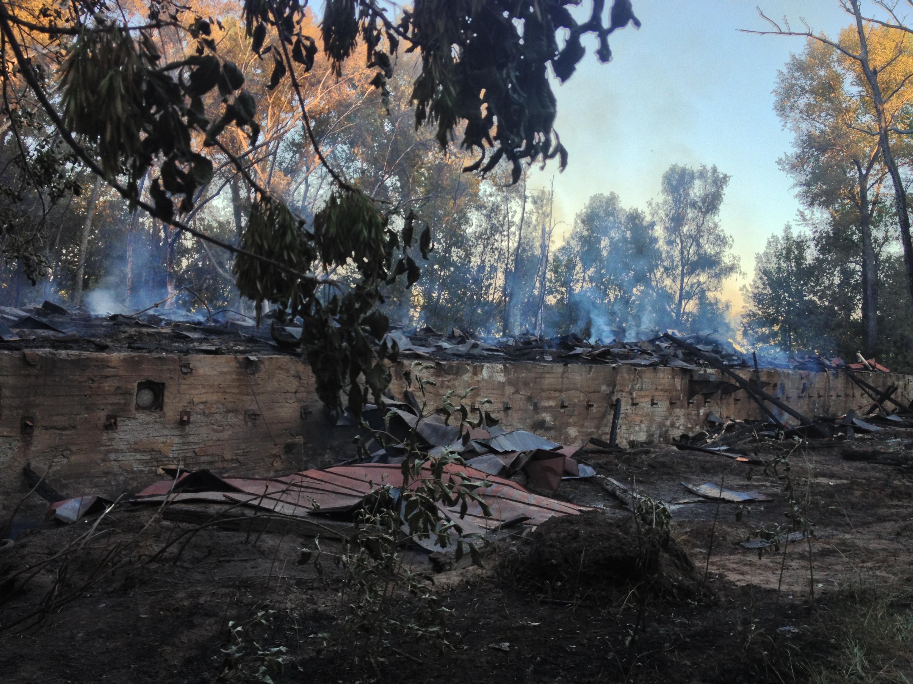 Никаких цветов там нет, это бредни. Сегодня вечером, когда уезжали оттуда, на Бобры завернули две пожарные машины. За пару часов до этого отломился кусок горящего дерева и упал в кусты за дебаркадером, видать снова разгорелось. Зрелище печальное.