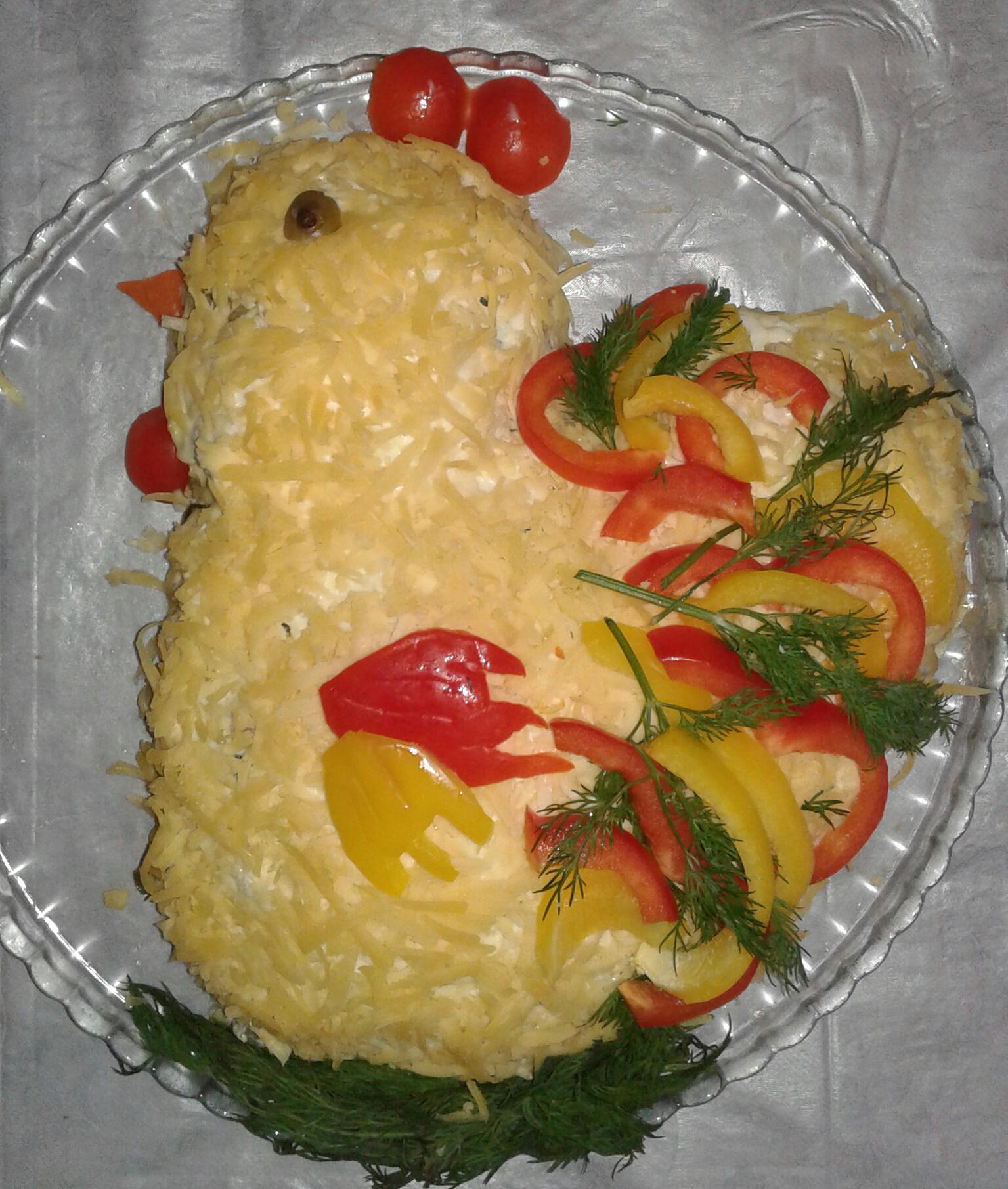 Салат "Японский" (слоями рис, пассерованный лук с морковью, тёртое отварное яйцо, рыба консервированная, тёртое отварное яйцо, майонез, зеленый лук).