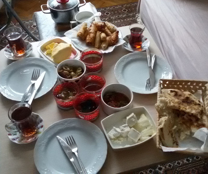 Менемен (омлет, он там в кастрюльке на фото), джем-мед-сыр двух видов-оливки трех видов-масло с домашним хлебом, сигара бёрек с творогом, еще был тушеный шпинат (на фото его нет).
