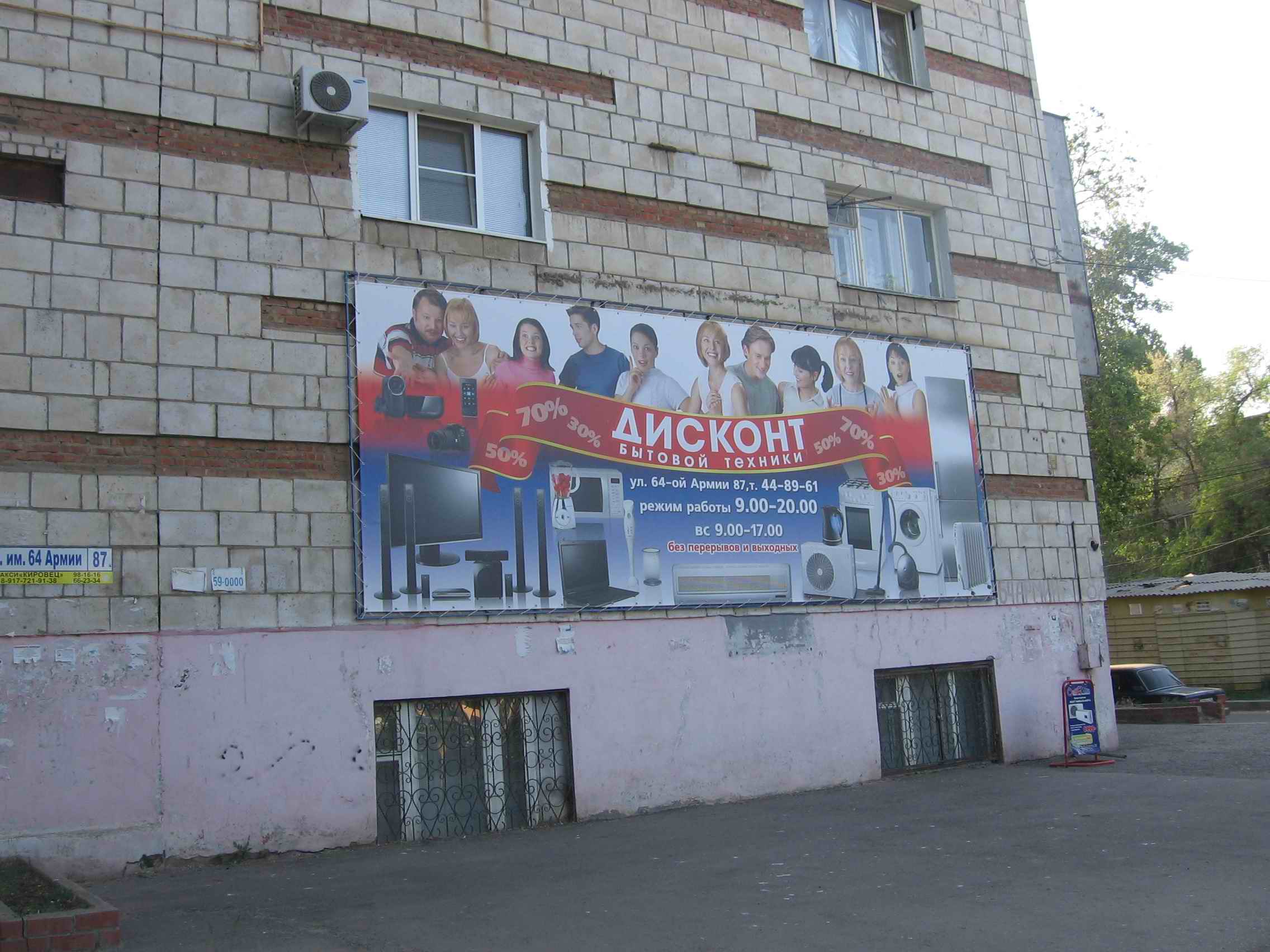 У вас вопросы по маленькой рекламе на двери , а у моего друга вот это чудо в департаменте по рекламе АдмВоло не признали рекламой, которую необходимо регистрировать. Договора с УК на резмещение конструкции на фасаде дома - общедомового имущества тоже нет. Магазин, что рекламирует данный банер находится в цокольной части этого же дома. Куда пожаловаться и как заставить владельца рекламы платить - они не знают.