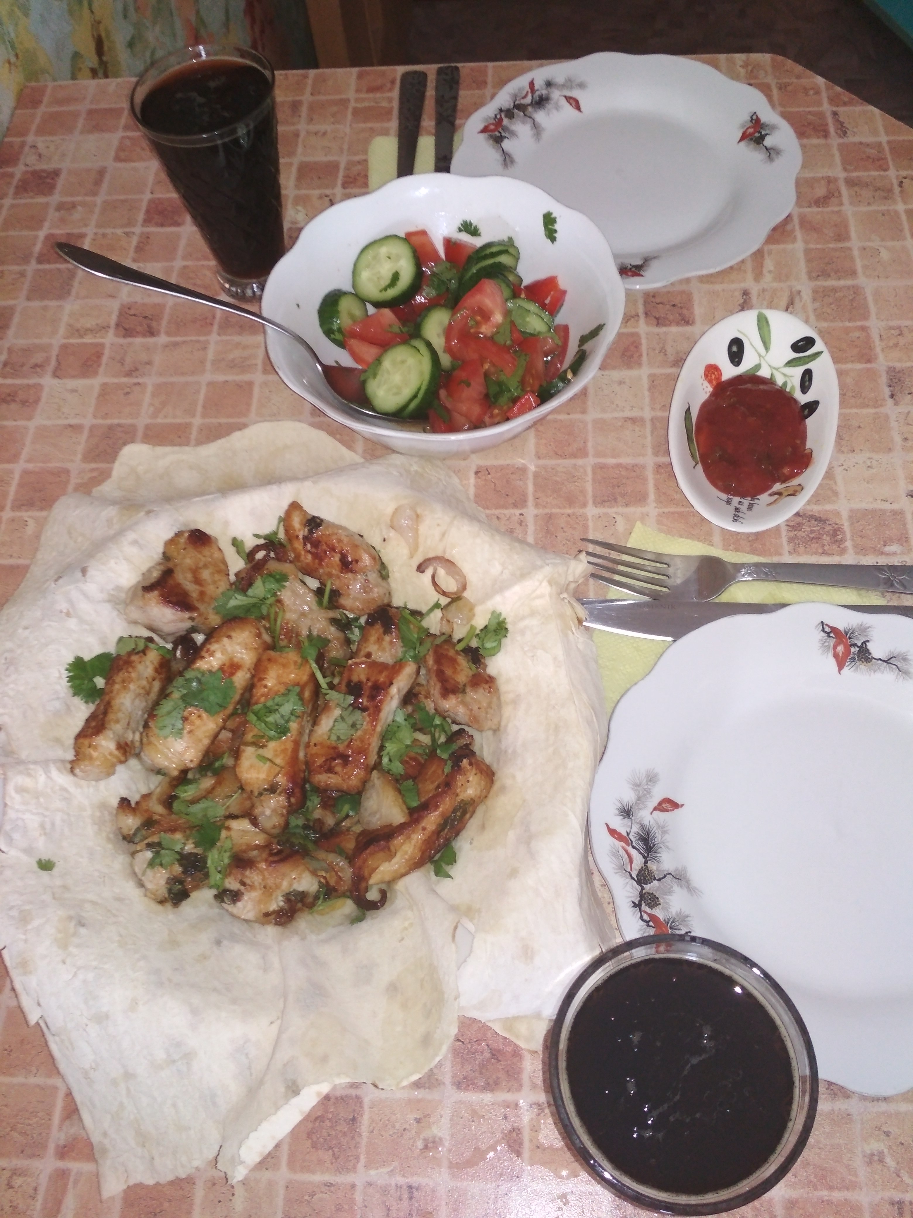 А! Был один шампур мяса, филе индейки мариновала в луке для кормящих матерей)) Но они и плова поели.
