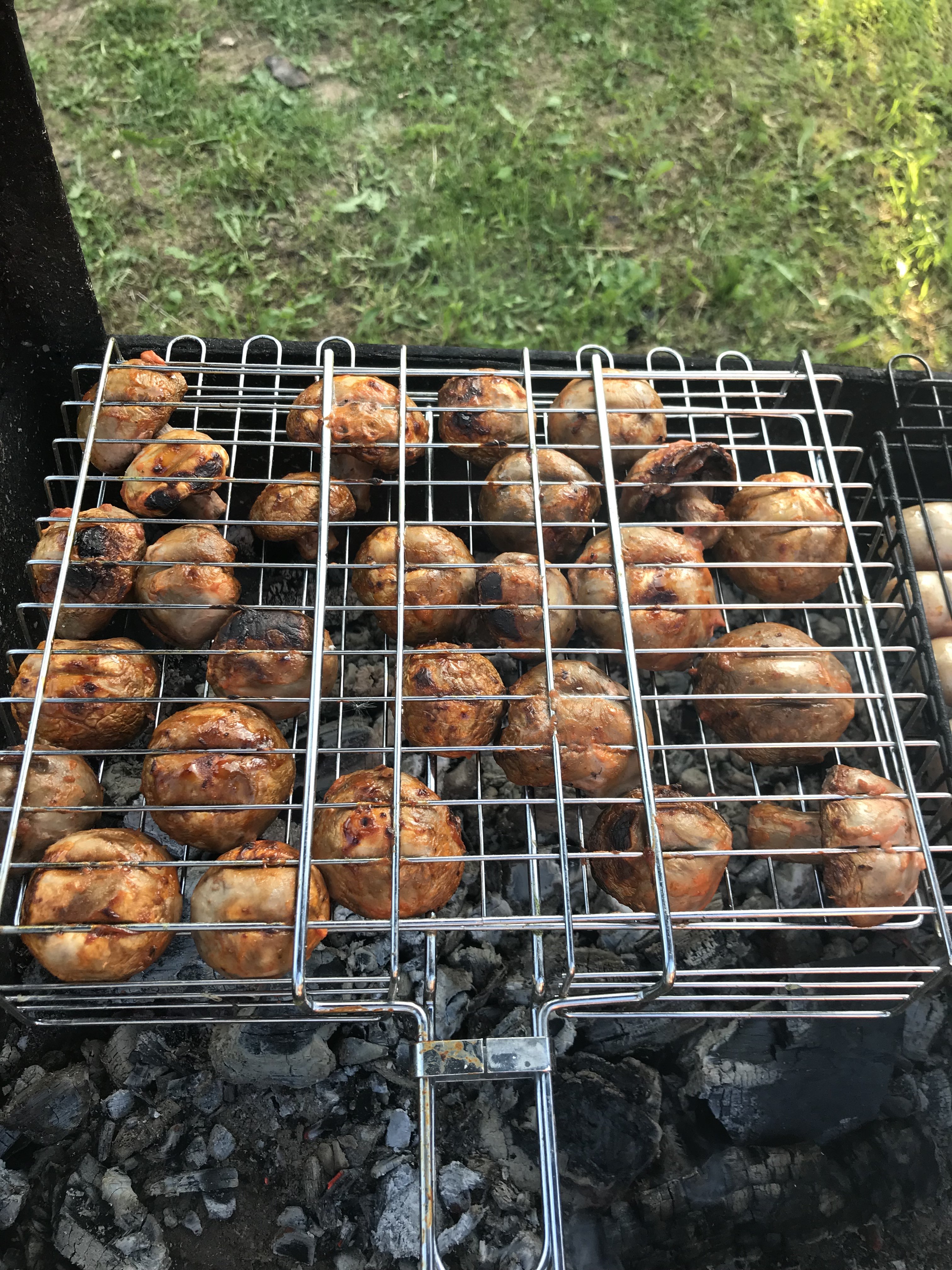 Грибы почистила. В чашу выдавила (на глаз) кетчуп, положила сметаны, соль, перец и в этом всём хорошо перемешала грибы. Мариновались 5 часов точно, а то и 6, просто на столе, в холодильник не убирала. Жарили на решетке.
