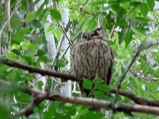 Лучше снять не получается, она на уровне 7 этажа. Снимаю с земли. Почему они в гнезде? Разве не в дуплах совы живут? И почему выбрали такое неподходящее место? Может из- за задымленности на том берегу Волги?