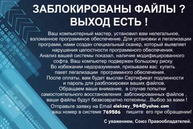 токо седня такое вылечил просто запустил антивир в сэйф моде там было пострашнее, про деццкое порно и УК, и требовалось 900 рублей кинуть тупо на телефон особенно понравилась завершительная часть требования, "обязаны удалить имеющийся разтакой контент блаблаба" ---------- Сообщение добавлено 05.06.2012 19:45 ---------- прикольно, если такое подхватит реальный педофил и чайник по совместительству )) ---------- Сообщение добавлено 05.06.2012 19:49 ---------- да, а пароль там предлагалось поискать на чеке терминала оплаты ))))
