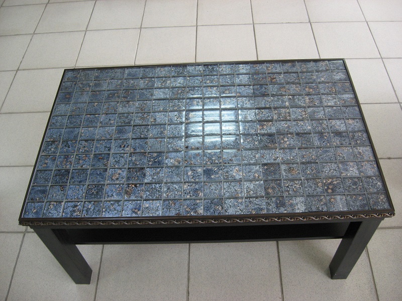 Вот тут на досуге переделал дешевый столик из икеи))) Мозаика "глубокая" - 8мм толщина стекла, клеил на двухкомпонентную затирку Литокол старлайк кристалл, ей же затерты швы. Край мозаики прикрыт багетом из полиуретана. В результате полностью "стеклянная" поверхность столешницы.