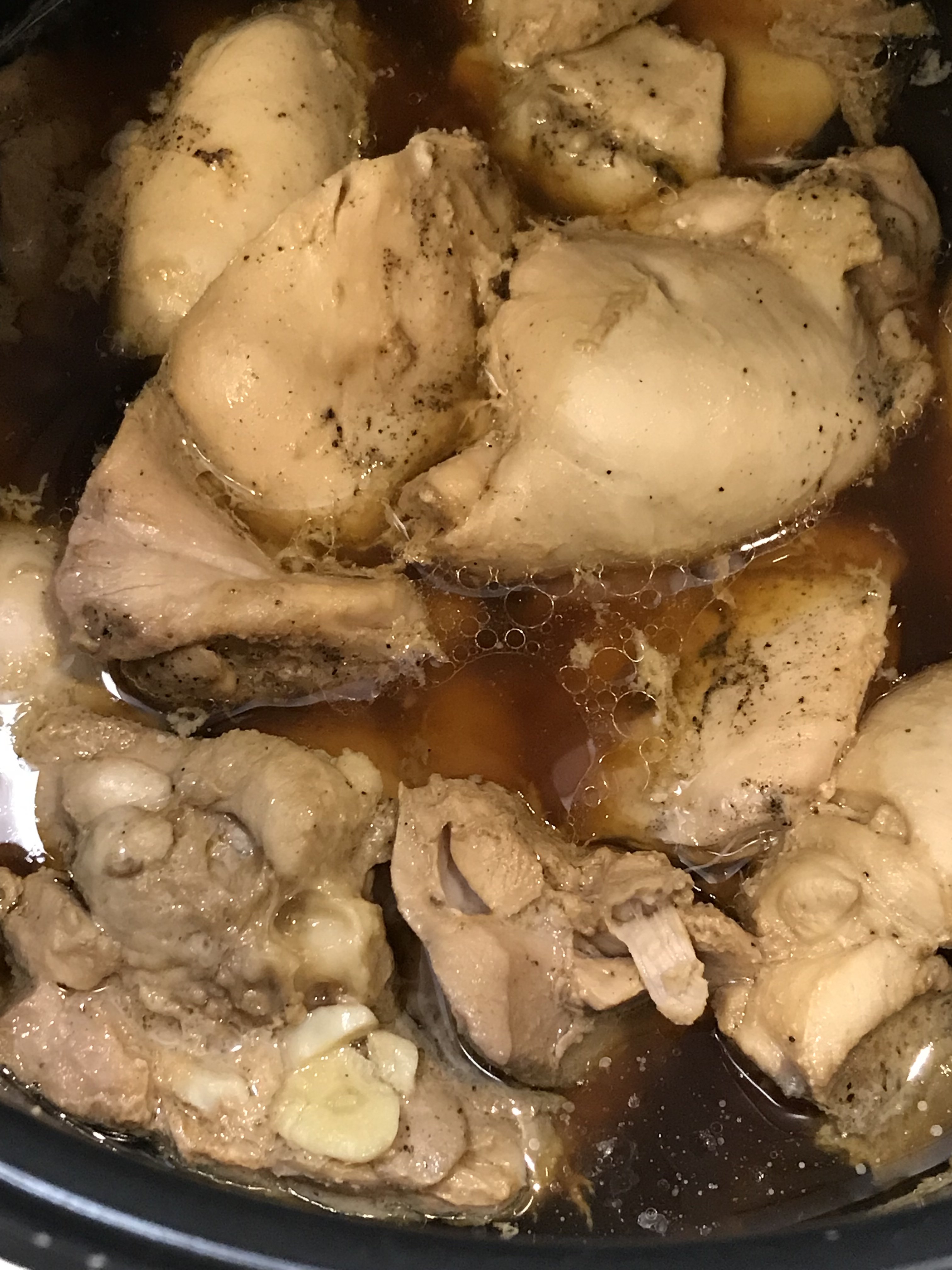 Куриное мясо бедра без кости замаринованное в соевом соусе и чеснок. Стояло не менее 30 минут. Чёрный молотый перец, немного воды и на 1 час в режиме Тушение.