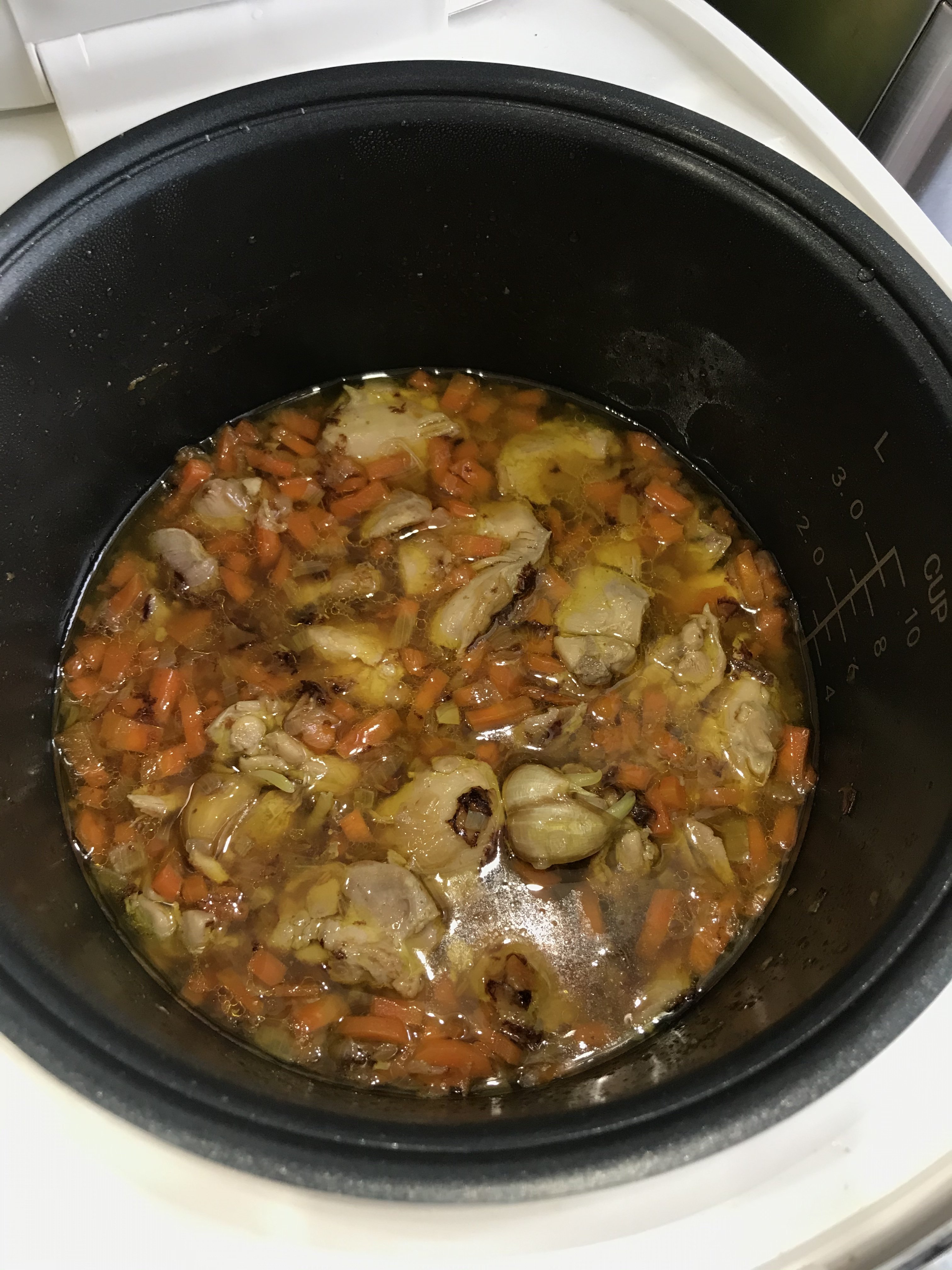 Куриный суп с вермишелью. Бульон: вода, мясо куриное (его потом порезала и вернула в суп), морковь, луковица, смесь перца горошком, болгарский перец, лавровый лист. Из бульона всё убрала, процедила через мелкое сито. Добавила картофель, лук нашинкованный, морковь на мелкой терке, кругляшку замороженного шпината, половину чайной ложки томатной пасты, кусочек сливочного масла, Соль. Режим Суп на 1 час. За 5 минут до готовности всыпала вермишель.