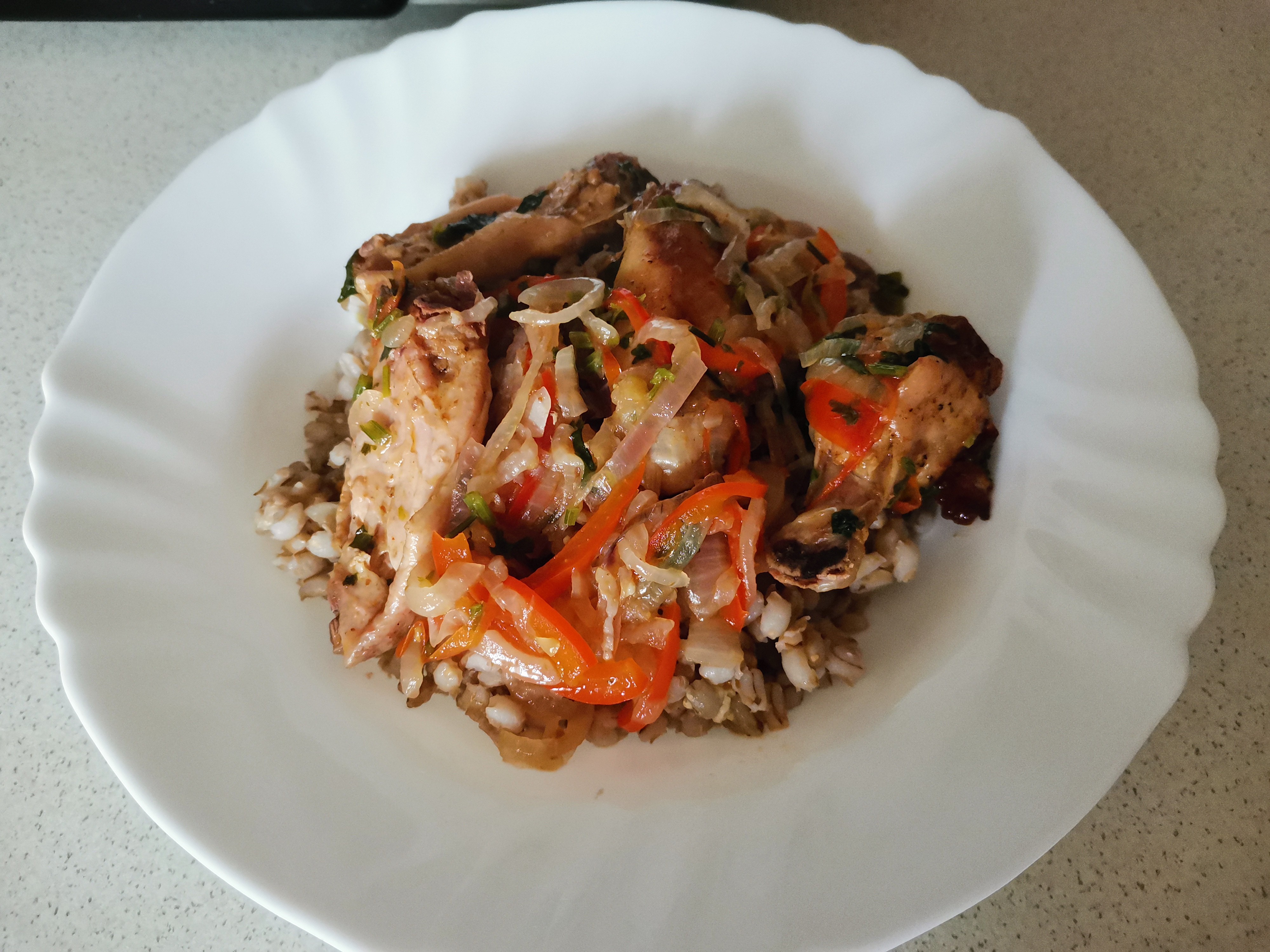Готовила чахохбили. Для этого берутся любые части курицы, у меня крылья. Замариновала их, приправила и отправила в духовку запекаться. Берём много лука, головок 5-6. Режем дольками 1/4. Жарим на сливочном масле в мультиварке лук. Нарезаем полосками болгарский красный перец (лучше красный, он слаще других), отправляем к луку. Нарезаем 1 крупный помидор или у меня были средние, у меня 4 ушло. Теперь всё солим. Достаём запечённые и подрумянившиеся крылья и смешиваем с овощами, сок от курицы туда же. Перемешиваем. Режем много кинзы, даже если кинзу не любите, в этом блюде её лучше не заменять. Я кушаю прям так, а кому хочется плотнее, тогда можно с гарниром. У меня вот вчерашняя перловка в ход пошла))