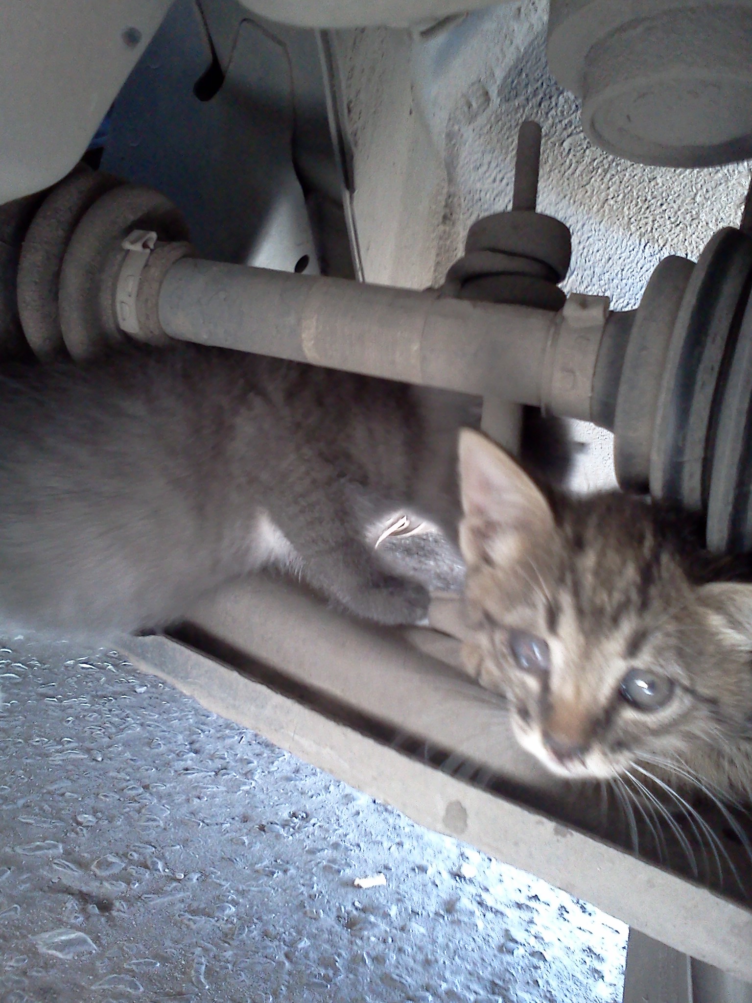 У нас во дворе котята жили. Днем, пережидая жару, валялись под машинами. Я приехала, видела что котята пошли под мою машину. Через час выхожу - нету, ну думаю уползли под другую. Приехала на дачу. Преследует мяуканье. Не пойму откуда... Всю дачу обошла... Нашла котят под капотом!!! Как они туда залезли... Как не померли от горячего двигателя.... Потусили они у нас там выходные и отвезла обратно во двор. Живых и здоровых.
