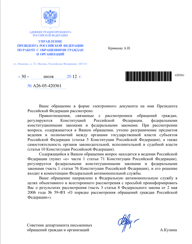 Пришел ответ от Министерства волгоградской области по тарифам и..... Бла-бла-бла на 4! листах. С выводом, что все пучком так как максимальный размер тарифа считается не по конкретной услуге, а в общем по всем предоставляемым населению услугам как то: горячее водоснабжение, холодной водоснабжение, отопление и т.д. Предельный рост тарифов должен быть не более 12% По расчетам министерства в моем случае рост тарифов составил 11,48% что не превышает предельной величины. Ответ за подписью министра Ангара Полицеймако.Так, что "где крестьянину правды искать?" Вот герой. з.ы. от ФАС пока ответа нет.