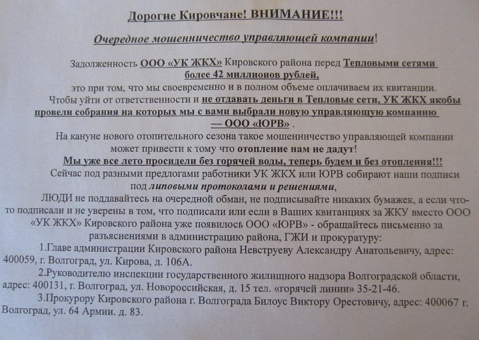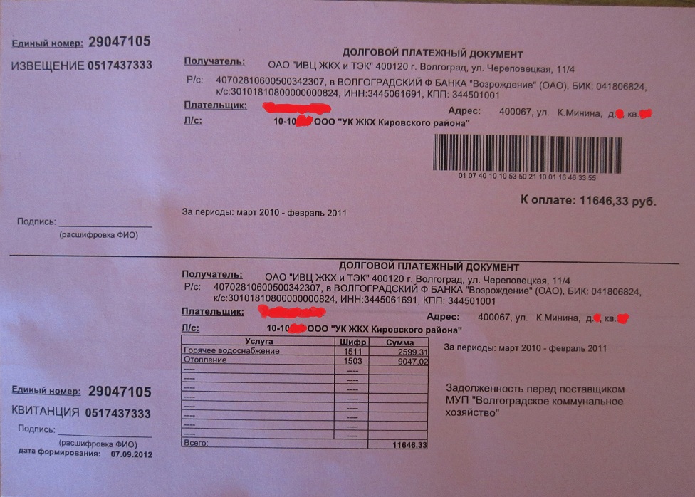 Сегодня обнаружил у себя в почтовом ящике две бумажки - квитанцию от МУП "Волгоградское Коммунальное Хозяйство", в которой меня объявляют злостным неплательщиком и выставляют мне счет на 11646.33р., и "анонимку" (похоже от того же МУП "Волгоградское Коммунальное Хозяйство"). Я всегда был прилежным плательщиком, и у меня хранятся оплаченные квитанции со времен царя Гороха. Так что, проворовавшиеся господа коммунальщики, разбирайтесь-ка лучше со своими "коллегами" из управляющих компаний, а я дважды за одно и тоже платить не собираюсь! :frustrate