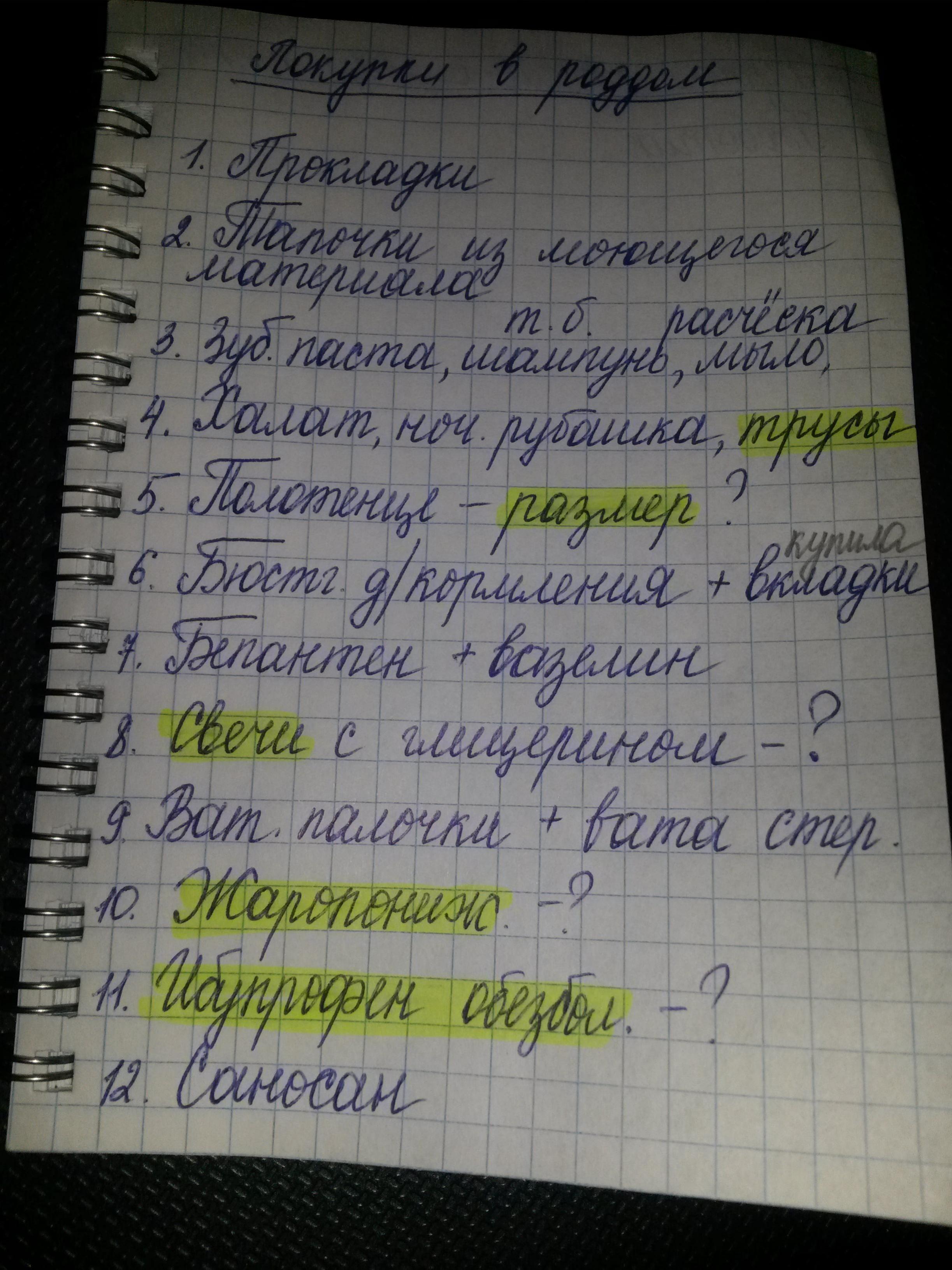 Shillen, из лекарств-ничего тебе там не пригодится, палочки тоже не надо. труселя покупаешь самые обычные хлопковые, не стринги, конечно, за них тебя там чуть ли не пороть будут полотенце-любое, с которым тебе будет удобно, одно для себя, второе для малыша о, еще про прокладки вспомнила-не покупайте специальные, всякие моли мед и тд, обычные ночные вполне подойдут Если тебе летом рожать, то вряд ли тебе понадобятся пеленки в больших количествах, будет страшенная жара, бодик, носочки и вперед. Пеленки на арбеоне продают, попроси бабушек, они тебе их нашьют