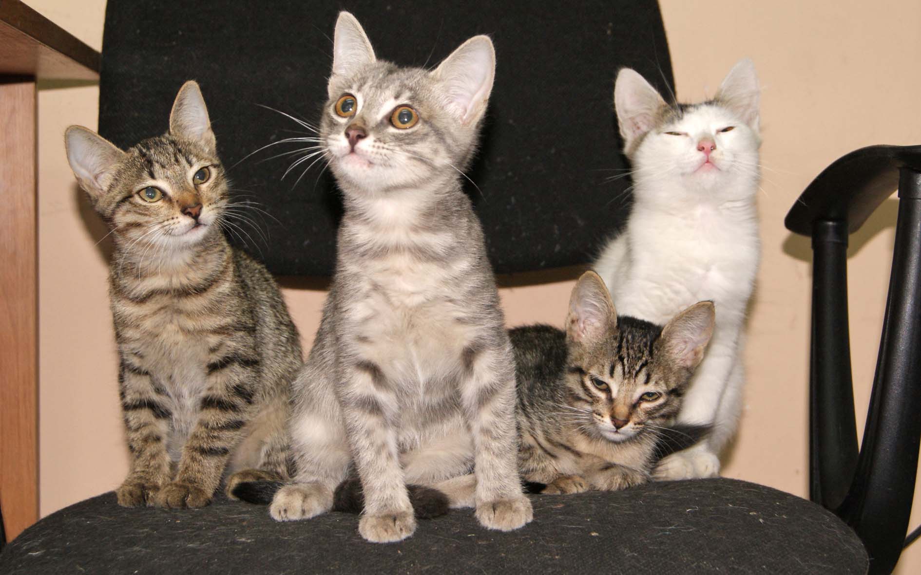 В туалет ходят исправно, в горшок с песком.Какашульки сформированные(желудочки работают хорошо) Едят все что из дома принесу -это на завтрак, : рыбу сырую, вареную,мясо сырое(говядина), вареное, а основной рацион---сух.корм вискас и роял канин, влажник любой. К рукам приучены, но долго не сидят,все в движении или к мамке под бочок,мурлыки все.