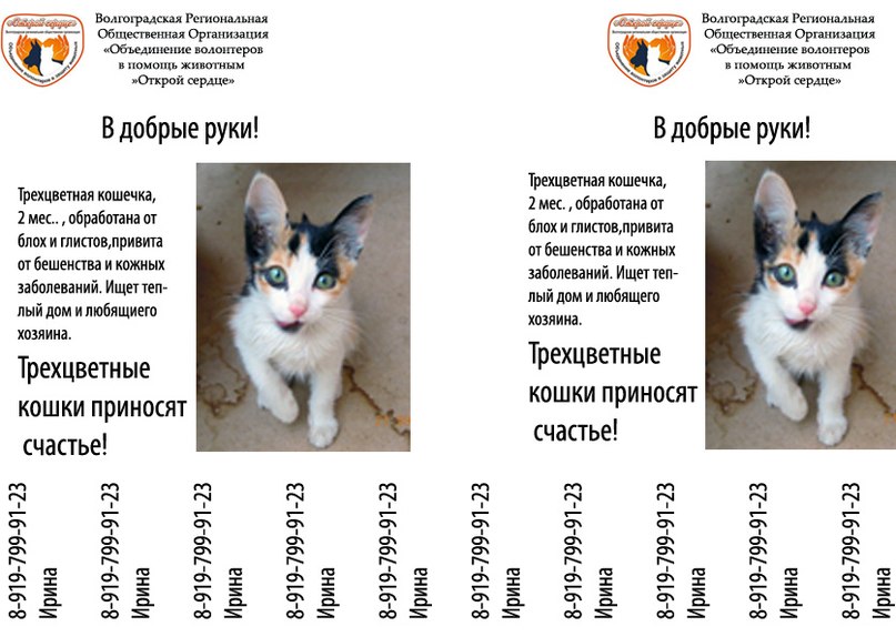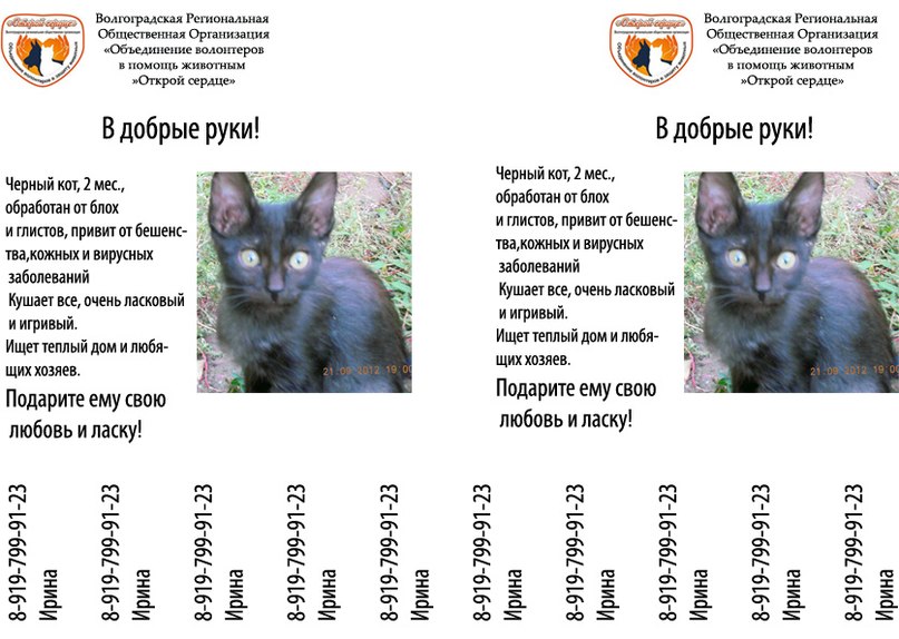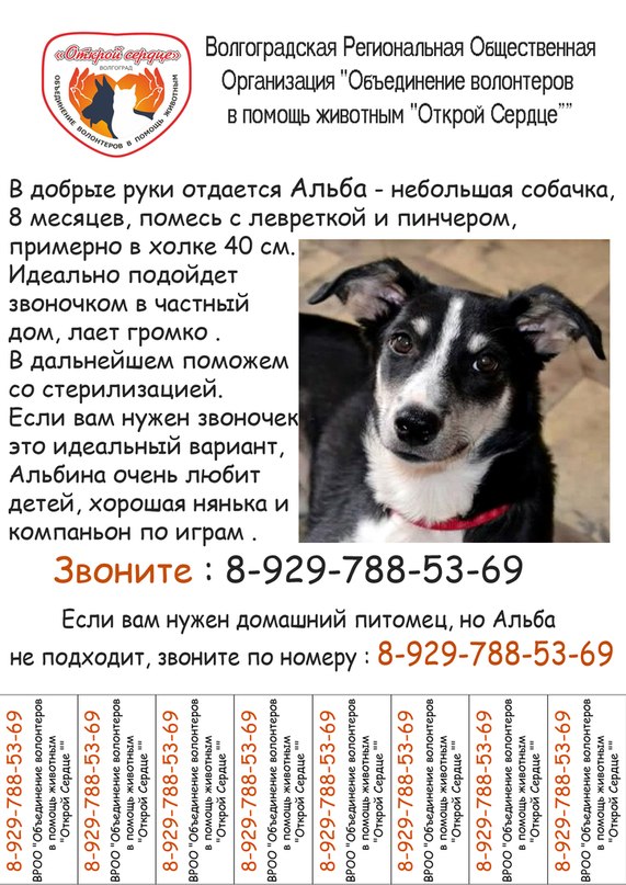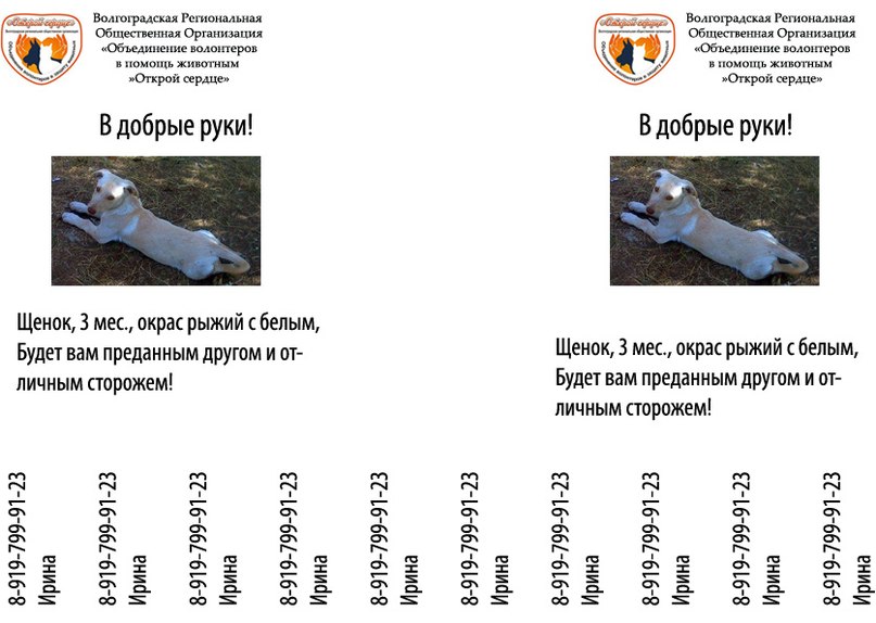 Елена Беспристрастная, вертикальные полосы между номерами телефонов - ну не нужны они) и, вместо названия организации - лучше написать - собака в добрые руки или что-то типа того)).