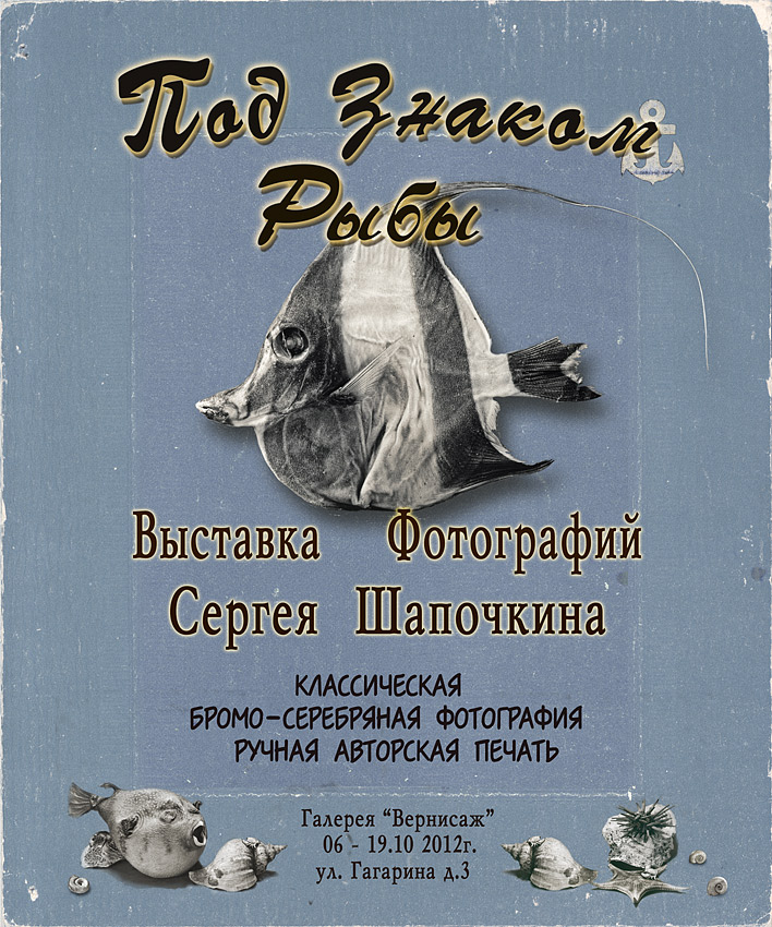 В центре города, в галерее "Вернисаж" (ул. Гагарина дом 3), с 06.10.2012 по 19.10.2012 будет проходить выставка работ Сергея Шапочкина "Под знаком Рыбы". Открытие состоится 06.10.2012г. в 13:00. Приглашаются все желающие!!! +++Теплый прием и легкий фуршет, вход свободный и бесплатный+++