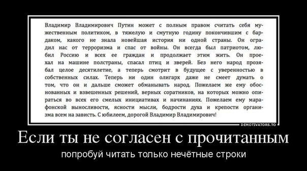 Doctor Zlo, ай респект! Про Мединского очень понравилось. Мне помнится был на страницах КомерсантЪа конкурс "Лизость к телу" в году этак 2009. Там и Рома засветился. И Никита (Бесогон) михАлков. (катати где он???) Мединский тоже хорошо. ---------- Сообщение добавлено 08.10.2012 09:01 ---------- Хм... 60+15+15 = от 90 до 120 Похоже Вы второй кто меня спалил. Воще-то широкое празднование ДР первого лица есть признак диктаторских режимов. Вот ей Б-гу слъезы щастья наворачиваются, когда видишь, как весь корейский (северный) народ в порыве любви обожествляет своего любимого руководителя Ким Чен %AdminName%. Так что согласен. Излишняя шумиха - признак банановости. ---------- Сообщение добавлено 08.10.2012 09:03 ---------- Походу, и правильно сделал.
