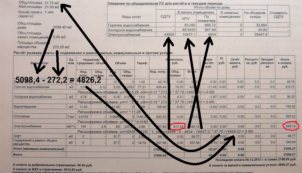 ОДПУ - 35359 ИПУ - 10935 По нормативу - 2900 Общедомовые - 21523 21523*пл.квартиры/площадь квартир дома = 224