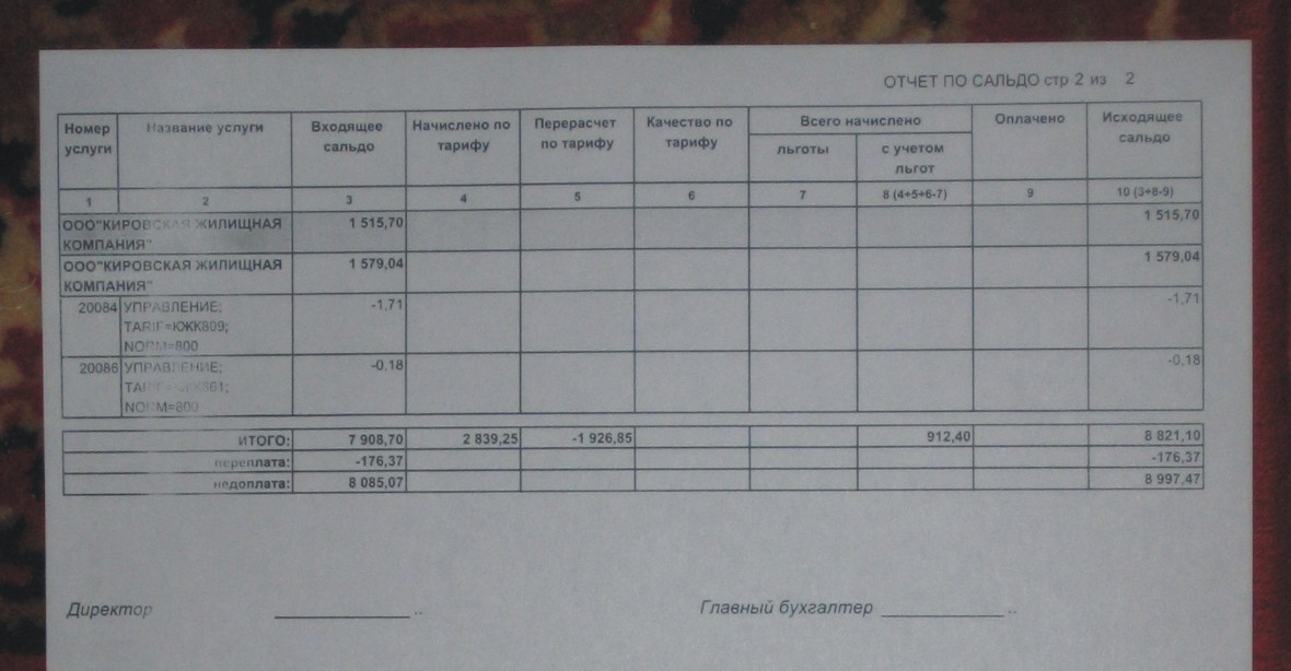 ОЧЕНЬ ПРОШУ КОНСУЛЬТАЦИИ: Добрался до сальдовых отчетов управляющей компании по своей квартире, выкладываю для консультации 2 страницы: 1. отчет по сальдо форма 11-Т-10 2. миниотчет по сальдо. Строки ООО "Кировская жилищная компания" - 1515,7 руб. встречаются на 2-х страницах, но сумма 1515,7 руб. одна и таже, предполагаю, что это один и тот же долг, но только два раза показан для разных нужд. Вопрос 1: сколько я должен в ООО "Кировская жилищная компания", а сколько в ООО "УК Кировская жилищная компания" ? Мои версии, что: - в ООО "КЖК" - 1515,7 руб. - в ООО "УК КЖК" - 7186,6 руб. ИТОГО: 8821,1 руб., что собственно на второй страницы и показано. Так ??? Вопрос 2: нам по отоплению делали перерасчет 2 месяца - 846 руб. и 1926 руб. Так вот 1926 в Сальдо отражен, а 846 нет. Почему ? Или может 846 руб., это не перерасчет по отоплению, а какие-то другие деньги ?