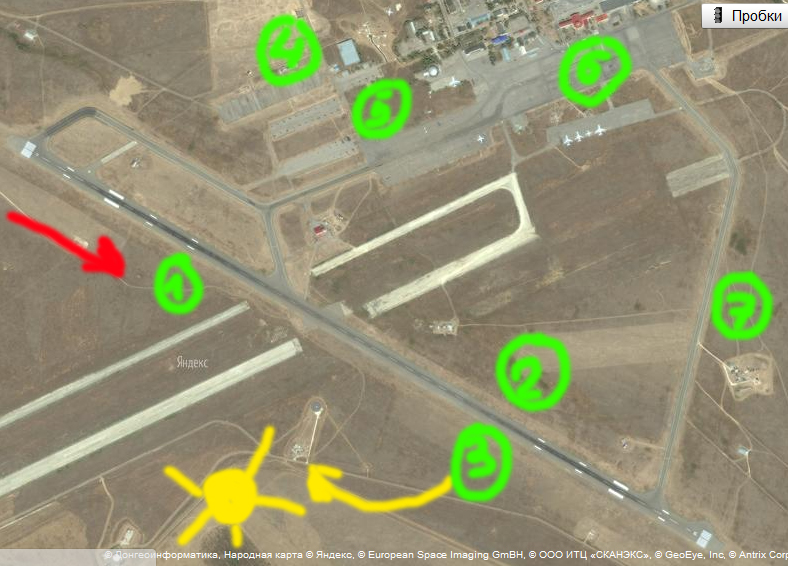 Погода на завтра: http://s1.ipicture.ru/uploads/20121105/pi5EVBz8.jpg Соответственно в работе 11я полоса, читать как - посадка не с Волги, а со степи. Изучаем Гумрак на яндекс или гуглкартах, прикидываем места съемки. По опыту - ближе 15 метров к полосе не пускали меня одного, мало ли как может выйти, толпу в 15 человек ближе точно не пустят. А так - искусственных возвышений немного есть вдоль полосы, но максимум на 2 человека. ---------- Сообщение добавлено 05.11.2012 18:32 ---------- http://s2.ipicture.ru/uploads/20121105/P7a6odqR.jpg Диспозиция: 1) Посадки 2) Вечерние взлеты в контре на фоне заката (если будет солнце) 3) Просто взлеты 4) Порезанные Ан-2 5,6) Перроны 7) и конец желтой стрелки - радары разнообразные. Желтая стрелка - направление движения солнца (если таковое будет).