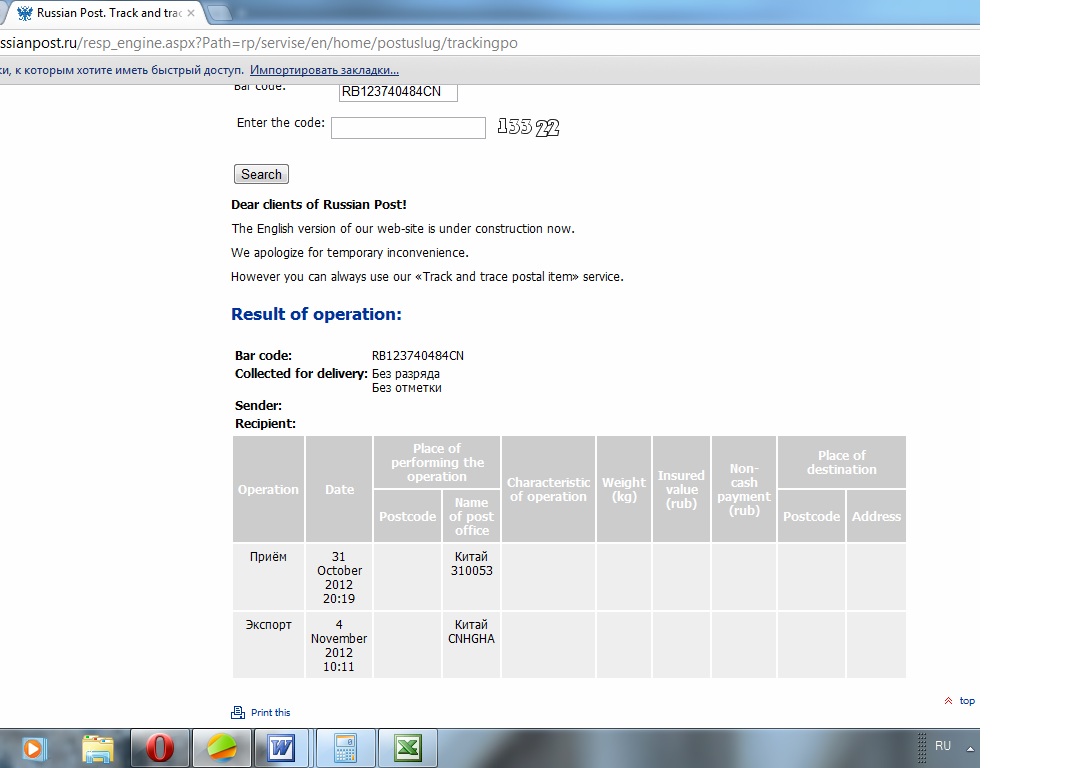 Иной гость, Трекинг говорит, что 04.11.12 он экспортирован из Китая, а вот импорта в РФ уже нет...и хде моя бандероль "шляется" -х .з.