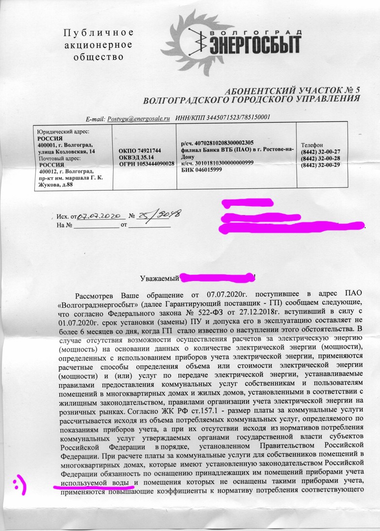 ))) Подал заявку на замену электросчетчика в связи с наступлением срока поверки, согласно нового закону)), в ответ прислали заказное письмо. Не могу не поделиться прекрасным)) Есть втут знающий человек, который мог бы мне вкратце растолковать, правильно ли я понял смысл данного послания: по закону можем поменять/или не поменять прибор учета в течение полугода, но платить будете пока по нормативам (!) (непонятно с какого перепуга, если по закону, при неподаче данных учета, должны насчитывать в течении трех месяцев по среднему за последние полгода и только затем - по нормативам, или я не прав?), а вот потом - суп с котом, их дальнейшие действия - тайна, покрытая мраком))) И к чему они обязанность по оснащению помещений приборами учета используемой воды приплели? И что мне теперь делать, распломбировать и менять счетчик самому или ждать с моря погоды? Накидайте вумных мыслей, плиз ...