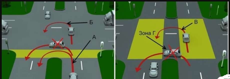 @-Евгенич-, на фотке я не нашел трамвайных путей... Вот на фотке два варианта перекрестка. Смотри как пересекаются ПЧ. Там так? Трамвайные пути "между" ПЧ (что видны на других фото того места) создают второй случай с пересечениями ПЧ. И если второе авто поворачивает как авто на фотке - это "встречка" и лишение. А что еще может "запрещать" разворот по малому радиусу? Разве что полосы для движения по перекрестку...