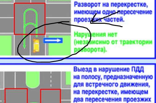 Удобство понятие относительное... Например можно долго спорить "как разъезжаться левыми или правыми бортами" при поворотах налево... А вот запрещено/разрешено вполне описывается ПДД Ты рисовал только там где одно пересечение ПЧ? Там возможен разворот по обоим траекториям. Одностороннее движение там никак не запрещает такой маневр. Или ты просто критикуешь ту картинку? Де там знак есть а в рассматриваемой ситуации его нет? Так это не дает никакой разницы в рассматриваемом вопросе. Тут главное пересечения ПЧ и нет ли выезда на встречку при выезде из них (пересечений ПЧ). Вот и все. @o000oo, вот если бы одностороннее движение было в другую сторону! Т.е. "в сторону разворота" - тогда и при двух пересечениях ПЧ выезда на встречку не было бы. И такой разворот (по малому радиусу) был бы не запрещен. Но не факт что удобен тем, кто сзади просто хочет поворачивать налево...
