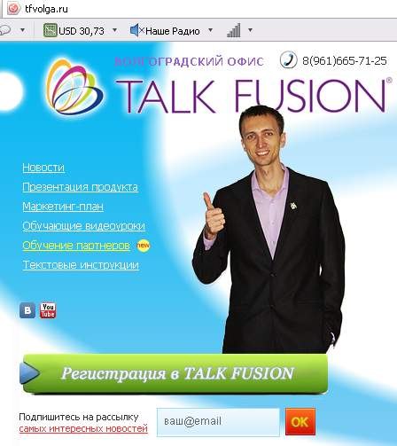 ...мне эту фигню предлагали еще пол года назад и посмотрев презентацию я заинтересовался и проверил каждый пункт! ...вот в этой статье http://www.tvoymillion.ru/post_1327850840.html факты с которыми не поспоришь т.е. все правда о TalkFusion!
