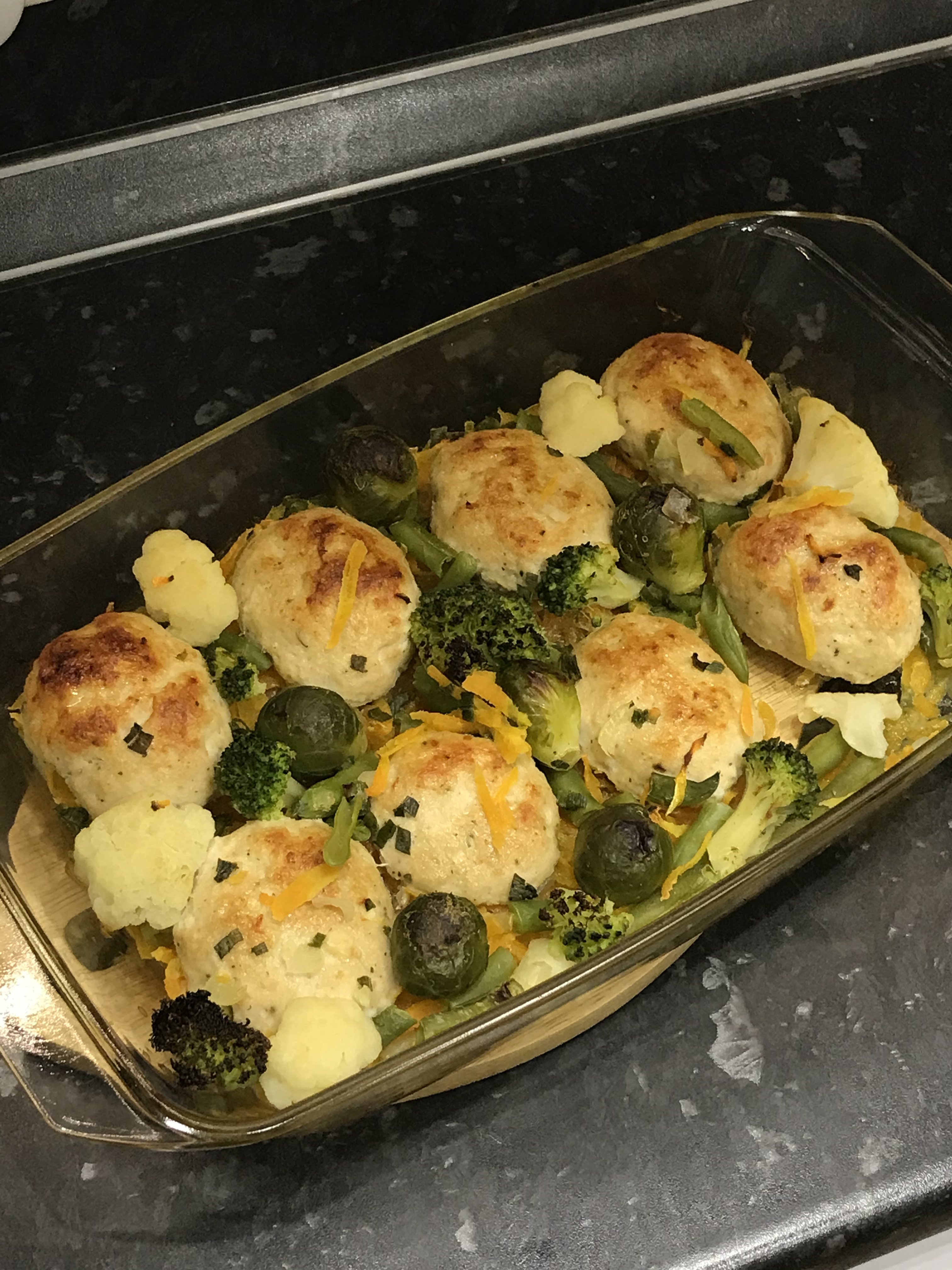Котлеты из филе индейки. Состав: грудка индейки, лук репчатый, чеснок, батон в молоке, соль, чёрный молотый перец, мускатный орех. Перекрутила всё два раза. Подушка репчатый лук плюс морковь. Овощи что было а морозилке: броколли, цветная, брюссельская, фасоль зелёная стручковая
