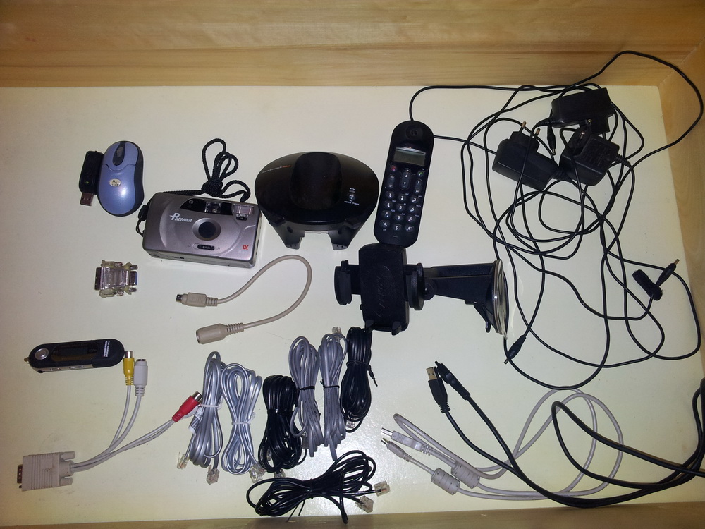 1. Радиотелефон Связной. Рабочий, требуется замена аккумулятора. 2.Плеер Panasonic с фм кассетный - рабочий. 3. СД-ром NEc не знаю, работает или нет. 4. mp3 плеер на 1 гиг. не пользованный. 5. мышь ps/2 инфракрасная вроде бы рабочая. 6. телефонные провода. от 1 до 2,5-3 метров. 7. мышь беспроводная. не знаю работает или нет. 8. Три зарядки от нокии, с толстым концом. 9. фотоаппарат пленочный. не знаю работает или нет. 10. автомобильный держатель для телефона. 11. переходник к компу для вывода изображения на телевизор. 12. кабель usm - miniu usb 13. переходник для подключения старых мониторов к видеокарте. 14. Asus P535 с коробкой и чехлом не работает экран. З.Ы. Пиво не употребляю.