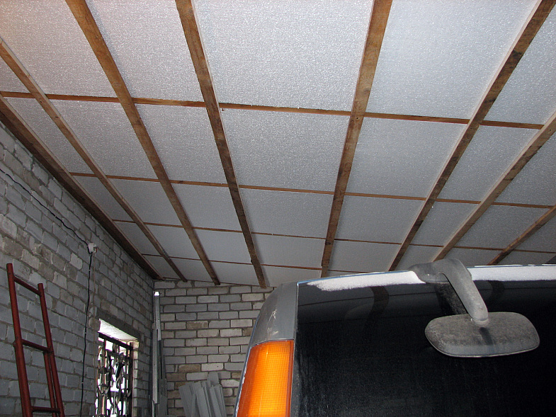 Ворота тонкое место. Я утеплил так, что инея совсем нет. один пенопласт тут не поможет. Сначала Стизол самоклейка Потом на него пенопласт наклеен. Ну и стены и потолок в два слоя тридцаткой пенопластом.