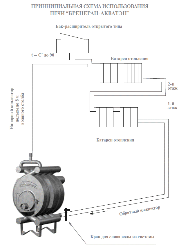 http://pechi.pro/pechi-otopitelnyie...kvaten-aotv---6-tip-00-do-100-m3-laoterm.html Мощность кВт: 6 Объем помещения куб.м: 100 Диаметр дымохода мм: 120 Высота, мм: 1290 Ширина, мм: 670 Глубина, мм: 850 Масса, кг: 150 Емкость камеры сгорания, л: 40 КПД, %: 70-80 Печь является мощным нагревателем жидкости для водяной системы отопления. Её можно использовать для обогрева бытовых и промышленных помещений, объёмом от 100 до 1000 кубических метров. Благодаря своей уникальной конструкции КПД печи достигает 70 %, а в зависимости от модели она работает на одной закладке от 6 до 12 часов. Печь «Бренеран-АКВАТЭН»- это цельносварная конструкция из стали, покрытая жаропрочной краской. Так что, по внешнему облику и материалу она вполне соответствует своему времени. А установить её можно в котельном помещении или подвале. Сам агрегат состоит из двух камер сгорания: нижней , камеры газификации и верхней камеры дожигания газов. Печь оборудована двумя регуляторами: на дверце вмонтирован регулятор мощности, а на дымоходном патрубке с задней части печи- регулятор-газификатор. Благодаря тому, что трубы, образующие корпус печи, на две трети находятся в топке печи, происходит максимальный нагрев теплоносителя, циркулирующего по трубам (батареям). Печь предназначена для работы в открытой системе, а подъём жидкости осуществляется самотёком. Благодаря инжекторам, выполняющим функцию своеобразных «дожигателей», достигается максимальное сгорание СО2. Для поддержания плюсовой температуры в системе в зимнее время (когда нет возможности обеспечивать работу аппарата за счёт твёрдого топлива) предусмотрена установка электрического тэна мощностью 1 квт. При соблюдении всех требований инструкции и пожарной безопасности гарантия на печь от производителя 2,5 года.