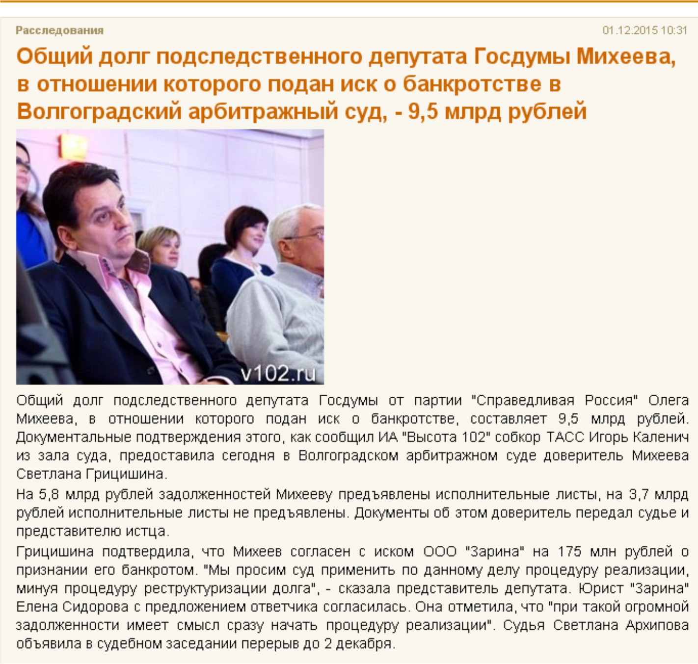 знаете где он ? Экс-депутата Госдумы от Волгоградской области объявили в федеральный розыск Объявлен в федеральный розыск бывший депутат Госдумы от Волгоградской области справоросс Олег Михеев, который скрывается от следствия. Как стало известно ИА «Высота 102», обвиняемый в мошенничестве экс-парламентарий также уклоняется от явки в прокуратуру для подписания обвинительного заключения по результатам ознакомления с материалами дела. Напомним, Олег Михеев обвиняется Главным следственным управлением Следственного комитета России в мошенничестве. Уголовное дело возбудил глава ведомства Александр Бастрыкин 4 марта 2013 года, после того как Госдума дала согласие на снятие с депутата неприкосновенности. По версии следствия, в сентябре 2007 года Олег Михеев подписал инвестиционный договор, согласно которому он обязался вложить в реконструкцию ОАО «Волгоградский моторостроительный завод» 100 млн руб. При этом договор предусматривал, что по завершении реконструкции или в случае неисполнения заводом обязательств недвижимое имущество завода переходило в собственность господина Михеева. Однако в 2009 году экс-депутат переуступил за 1 млн рублей право требования долга с завода родственнику Виталию Попову. И в 2010 году суд признал за ним право собственности на 14 объектов завода на сумму свыше 500 млн рублей. По версии следствия, таким образом господин Михеев незаконно получил контроль над предприятием. Второй эпизод в уголовном деле господина Михеева связан с покушением на хищение путем мошенничества 2,1 млрд рублей у «Промсвязьбанка», который в 2008 году приобрел принадлежавший экс-депутату «Волгопромбанк». По версии следствия, являясь председателем совета директоров и собственником акций, господин Михеев оформил фиктивные договоры возмездного оказания услуг. По этим договорам господин Михеев взял на себя обязательства погасить кредитную задолженность подконтрольных ему предприятий перед "Волгопромбанком", составившую более 1,4 млрд рублей. А с целью хищения экс-депутат оформил договоры поручительства от имени банка по договорам возмездного оказания услуг. Как ранее заявляли в СКР, господин Михеев при этом дал указание президенту «Волгопромбанка» не отражать обязательства банка в бухгалтерском учете, тем самым скрыв от «Промсвязьбанка» обязательства кредитного учреждения лично перед ним. Притом что никакие условия договоров возмездного оказания услуг между господином Михеевым и подконтрольными ему фирмами не исполнялись. В феврале 2011 года господин Михеев через Советский районный суд города Волгограда попытался взыскать с «Промсвязьбанка» дополнительно 2,1 млрд рублей. Однако, как сообщили в ГСУ СКР, преступление Олегом Михеевым не было доведено до конца, поскольку решением суда в удовлетворении исковых требований ему было отказано. Сегодня ИА «Высота 102» стало известно, что справоросс объявлен в федеральный розыск. Это значит, что сотрудники любых правоохранительных органов, транспортной полиции (линейных отделов, в том числе РЖД) должны задержать обвиняемого для принудительного доставления по месту требования органов следствия, суда или прокуратуры. Следователи ГСУ СКР ранее взяли с Михеева подписку о невыезде, обязательной явке в городе Москве по месту пребывания. В назначенный день он не явился, в нарушение закон