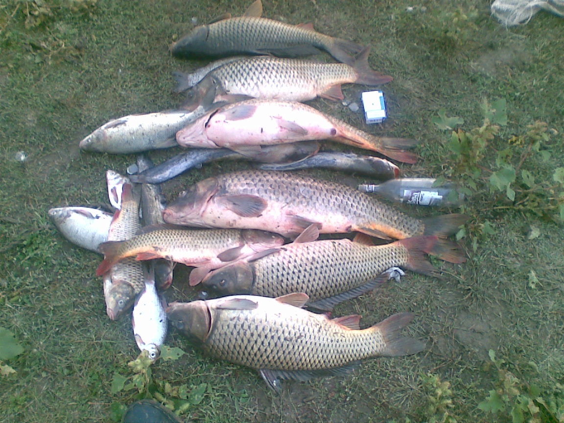 Поехали в командировку в астраханскую область. На заводе нужно было быть в 8-00 во вторник, соответственно выехали в понедельник, потому как места известные. Загрузили снасти, купили наживки и поехали. На месте было в 19-00, расчехлились и стали ловить. Из насадок были черви, опарыш, бойлы. Клев ждали ближе к 24-00, но ожидания не оправдались, и первого сазана подняли через пол часа после заброса. И дело пошло. Кроме сазана были сомики, подлещики, душманы. Ловили с понтона через Ахтубу, до 2-х часов ночи. Улов на фото. Весов не было. Ну кило на 6-8 самые крупные были.