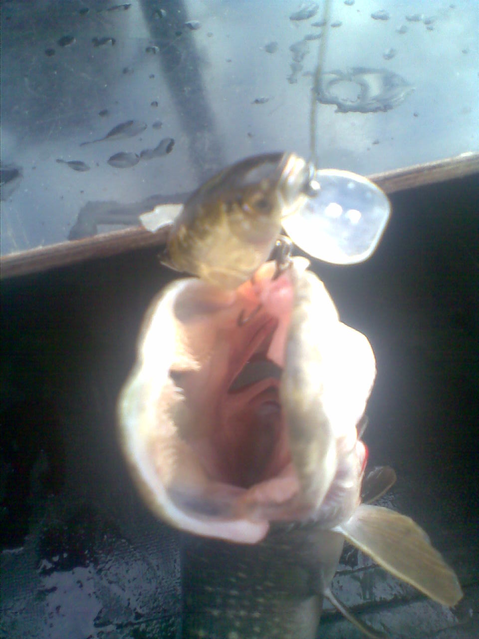 Еще вспомнил прикол с крайней вылазки. Забросил его, начинаю твичить потихоньку. Атака - мимо. Останавливаю, жду. Атака (по стоячему) - мимо! Жду, - тишина. Начинаю легонько шевелить воб. Тут подлетает щучка докилошка (вода прозрачная, все видно), хватает воба за его железный хвост и начинает неистово мотылять своей головой (ну типа оторвать хочет, тварь). Ну все, думаю - опять хвост у мегабасса оторвут. Ан нет! Остался на месте, выдержал и подсечку. Рыбка правда не засеклась ибо там (в хвосте) не за что