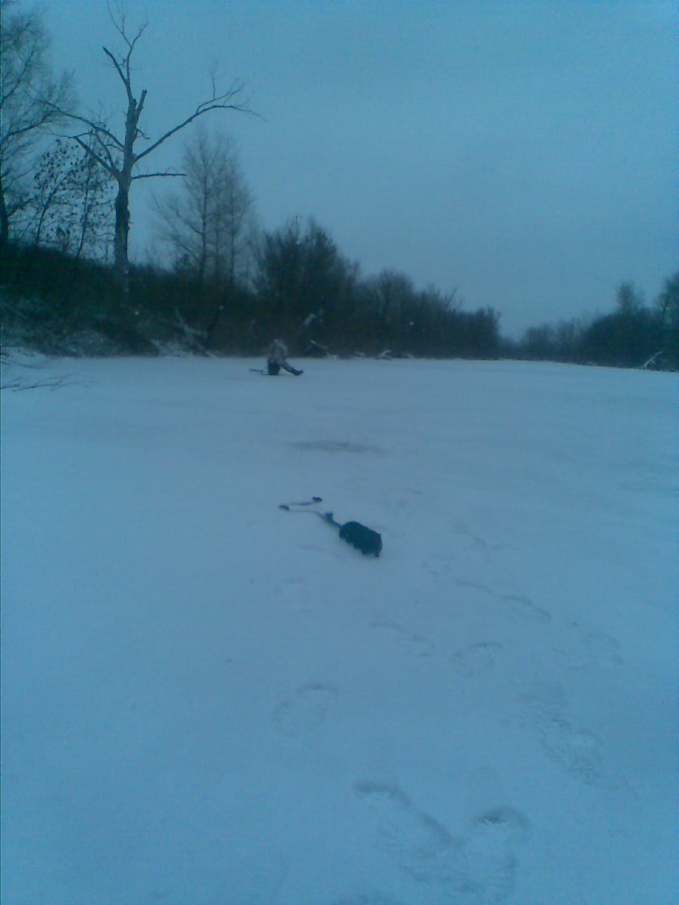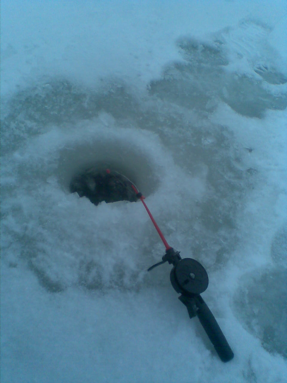 Разведка показала, что на том водоёме, где ходили- бурили, лёд 10 см, но двойной. Основной, который первый 3 см, остальные 7 - это спресованый снег, залитый водой и подмороженный южными волгоградскими морозами. Поклёвок не увидели, опробовал новые ножи на буре, через час поехали домой. Полосами была метель.