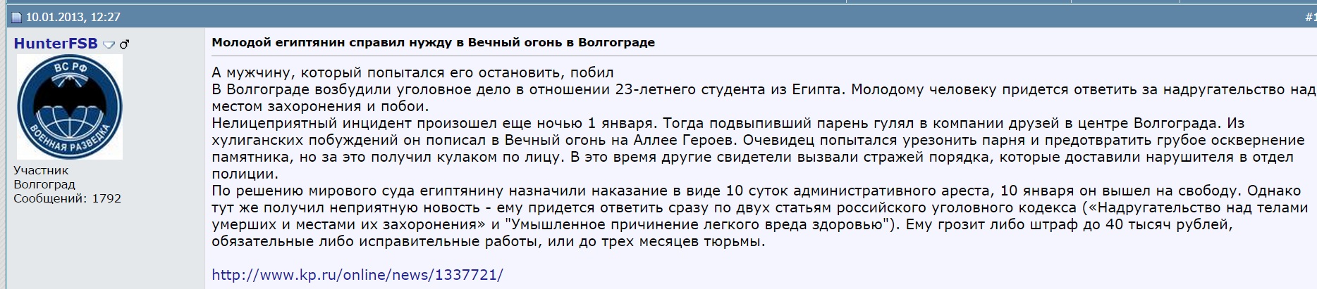 К сожалению, это не первый и даже не десятый случай в России, когда оскверняли Вечный огонь. В Волгограде в январе 2013 года пьяный египтянин помочился на мемориал на Аллее героев. Студента задержали. Суд вынес весьма суровый приговор – полтора года колонии поселения.