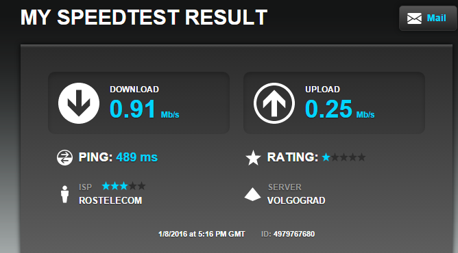 У меня все работает, и там где я работаю - тоже все работает) В том числе и интернет. ---------- Сообщение добавлено 08.01.2016 19:41 ---------- Вот, вечер. выходной. Максимально возможная скорость на данном типе подключения у нас на раёне.
