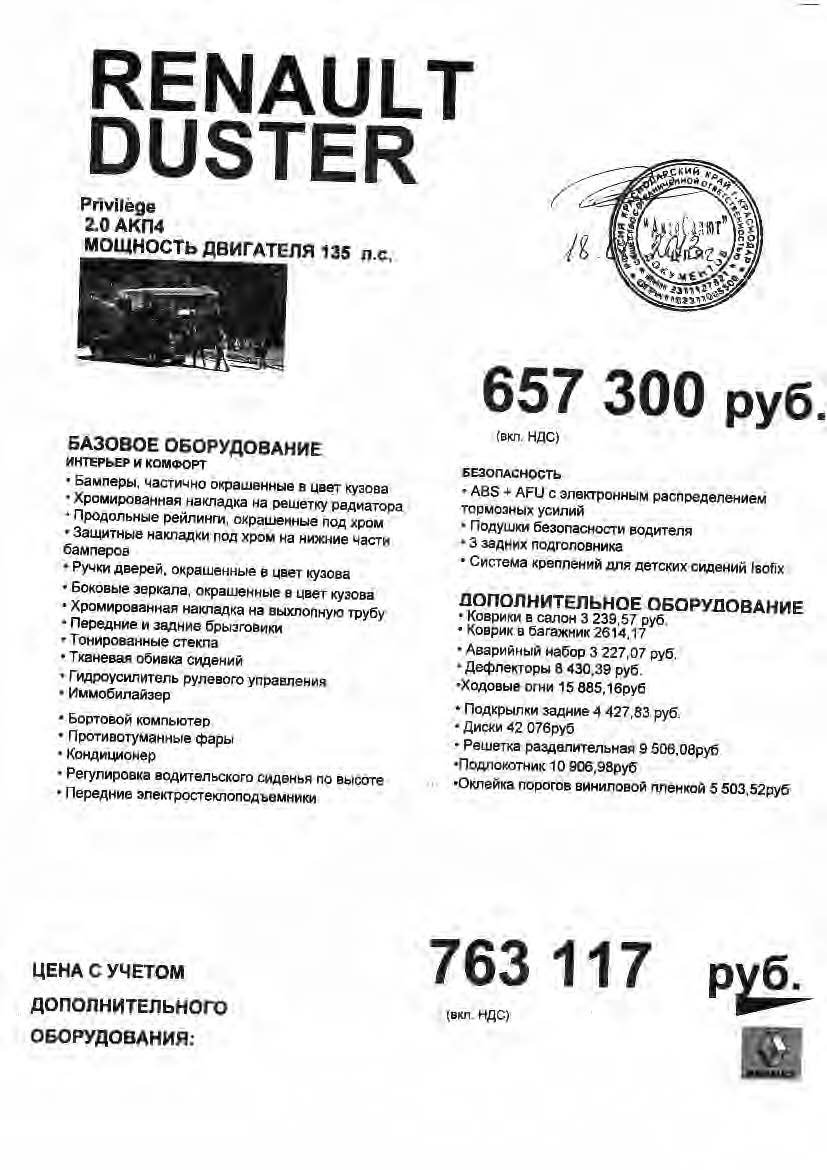 согласен. за такие деньги нах не надо. выкидывать больше сотки за свистелки и перделки сомнительного качества глупо. дхо за 16 руб. слов нету. ковры в салон-1000 в багажник-500 дефлекторы-1000 дхо-1000(хорошие) подкрылки-1000 диски-15000(по своему вкусу) подлокотник-500 решётка-х.з.,допустим 1000(макс) оклейка порогов винилом-ноу коммент аварийный набор-1000(хороший) итого:20000. ДВАДЦАТЬ ******! но не 105817 за сотку можно взять ниву-говномес за дастер готов отдать только ту цену,которая висит на оф. сайте рено