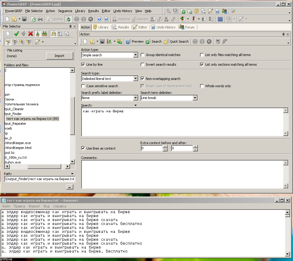 Народ, кто в теме. Никак не могу настроить прогу чтобы выбирала ключи в которых искомая фраза была бы НЕ в точном совпадении.. Пример: "как играть не бирже" - не находит "как играть и выигрывать на бирже" На скринах вообще первые строки из текстовика подходят, а PowerGREP выбирает с 27 строки...