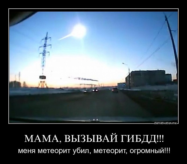 Цитаты на злобу дня: "американские каменты по сегодняшнему метеориту: “Какого хрена в России у всех камеры в тачках, это закон какой-то?”, “Почему столько видео из России из машин?”, “Почему всё охрененное всегда происходит в России?” . Самое крутое - “Русские записали падение метеорита с хрен знает скольки ракурсов, а у американцев нет записи, как сраный самолет падает на Пентагон???” И еще один, из другого форума- Русские даже знают где метеориты падают. Снимали из разных точек. Их ПРО превосходят наше на несколько десятков лет."