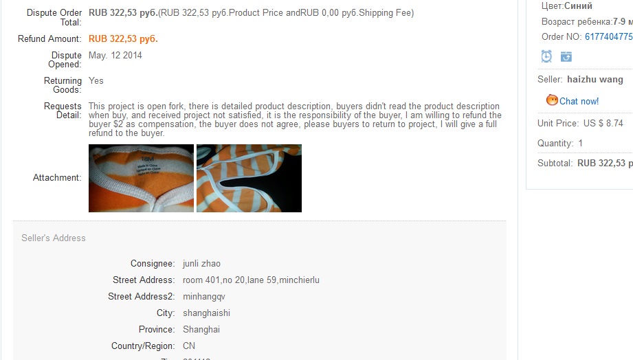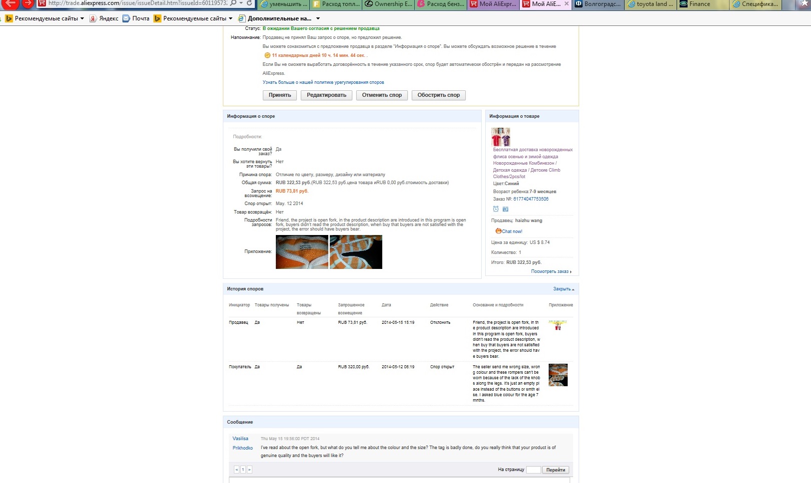 А там чего, в описании у продавца написано дженуин квалити? )) Любят они такое. Предложение продавца не принимай, что там за кнопка "Редактировать"? Ладно, фиг с этой кнопкой )) Напиши "Прошу выслать комбинезон того цвета и размера, который я заказывала". У тебя чего-нить осталось в твоих заказах? Картинка синего комбеза и возраст? Или там было написано типа: "Много цветов, при заказе пишите цвет и возраст"? ---------- Сообщение добавлено 16.05.2014 09:58 ---------- Всё, увидел, извиняюсь. Тогда какие вопросы? Пиши, чтобы прислал то, что заказывала. И всё, больше ничего не пиши. Если тебе нужны деньги, пиши, что "я уже заказала синий на 7 месяцев у другого продавца, посылка придёт через 5 дней и Ваше предложение выслать синий комбез для меня неактуально" ---------- Сообщение добавлено 16.05.2014 10:00 ---------- И имя с фамилией затирай )))