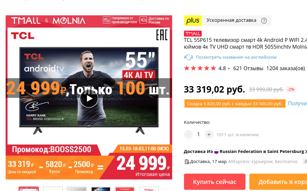 опять за 24 55" TCL выложили https://aliexpress.ru/item/10050014...932810875.1604945787&sku_id=12000016314078673